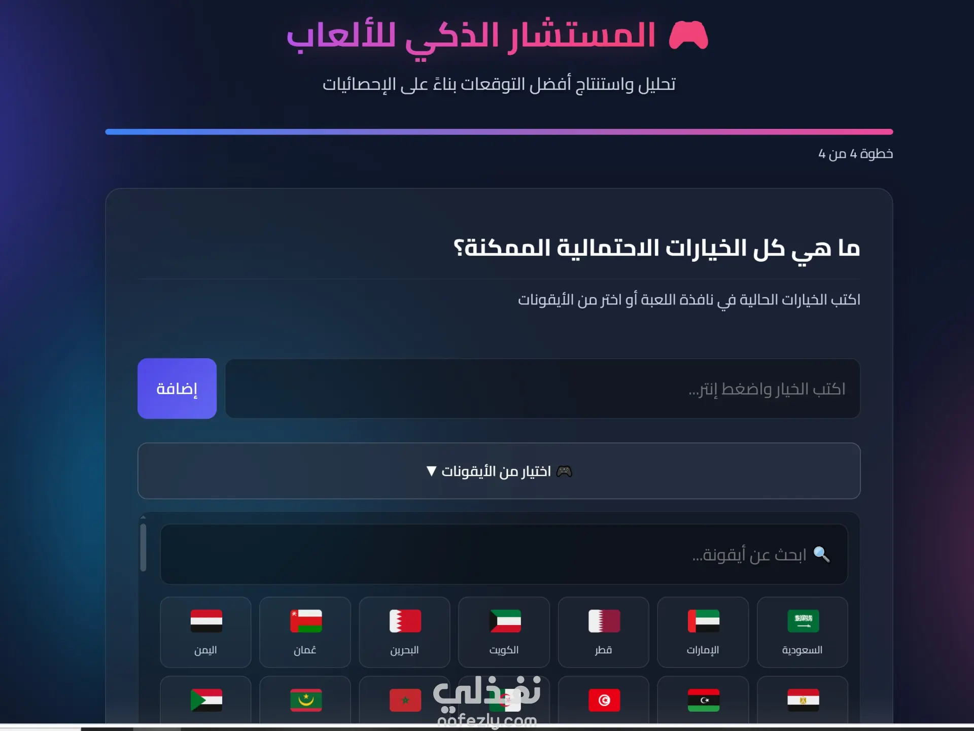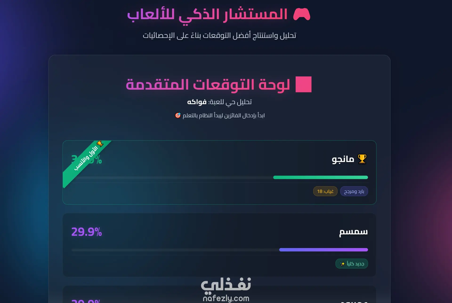 بعد التحليل يعرض الموقع أفضل التوقعات المحتملة مع نسب احتمالية لكل خيار.
