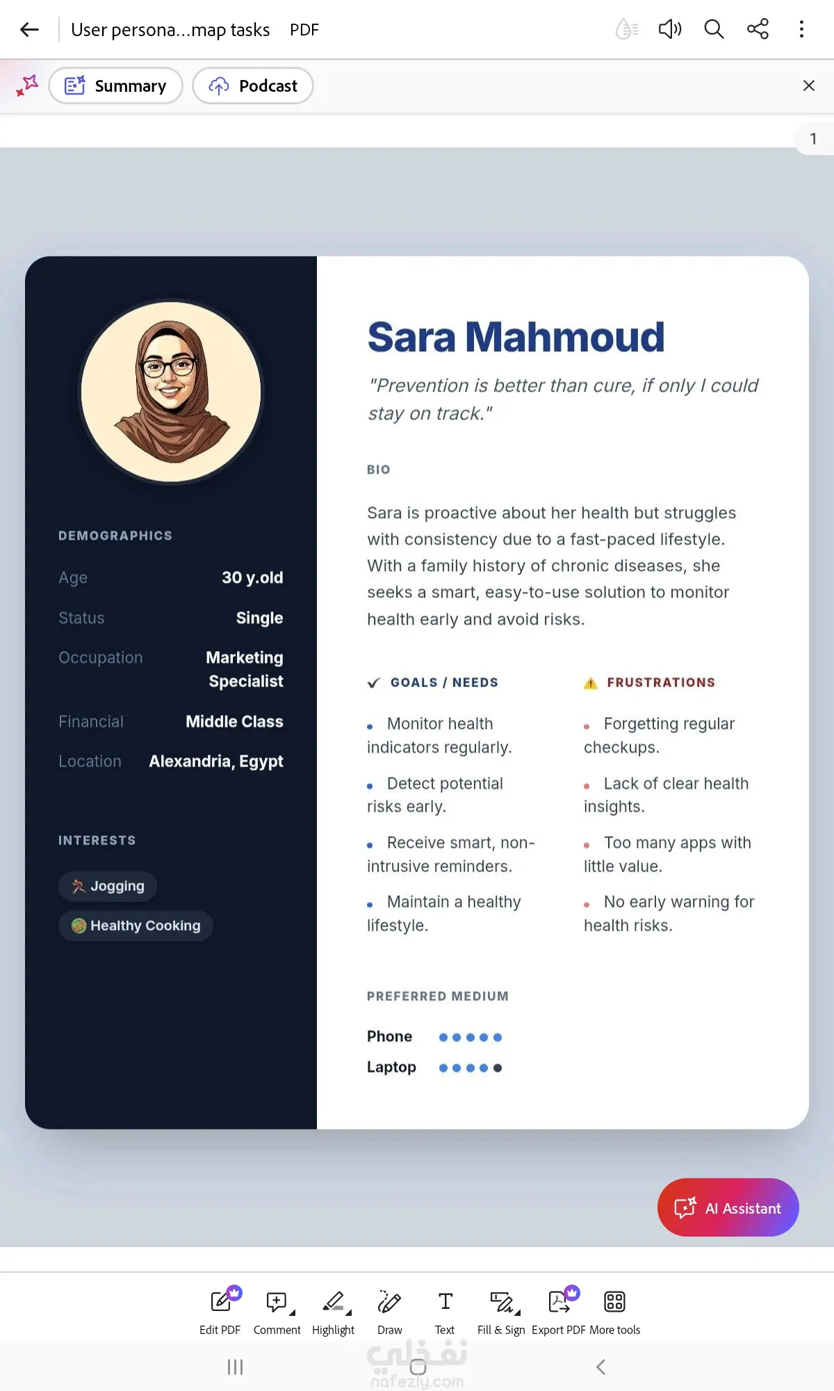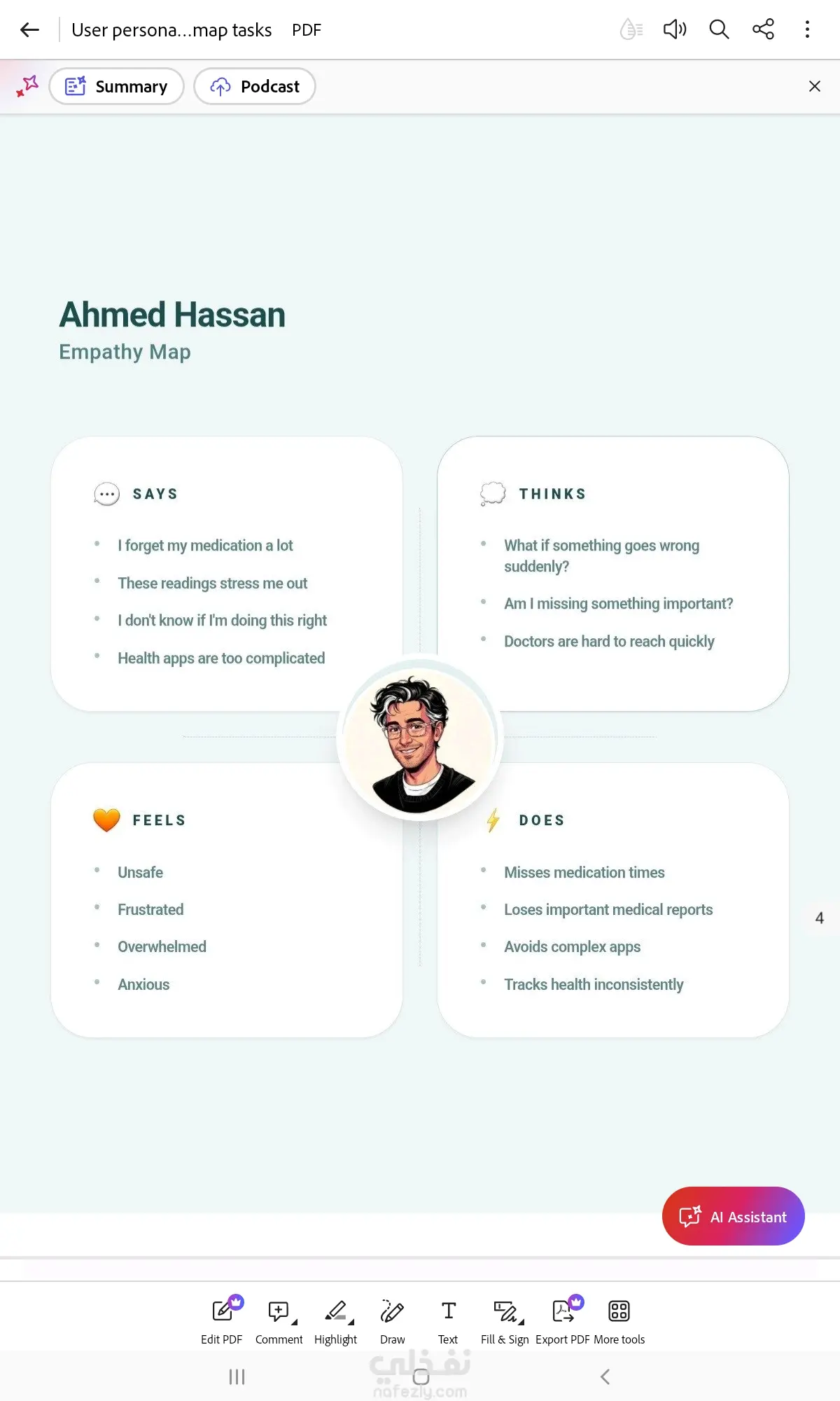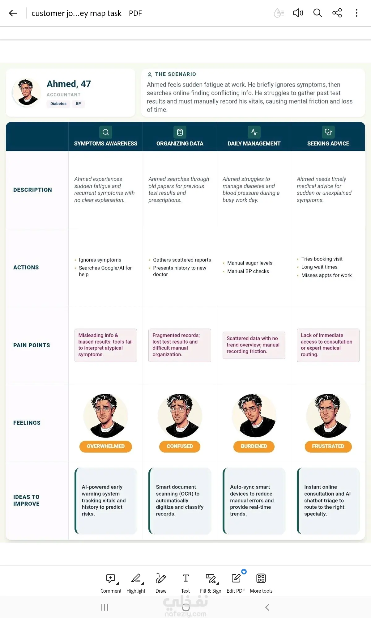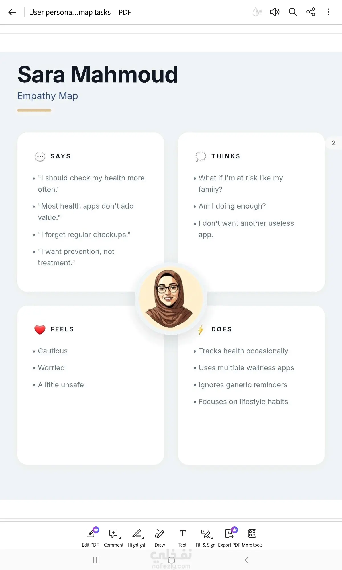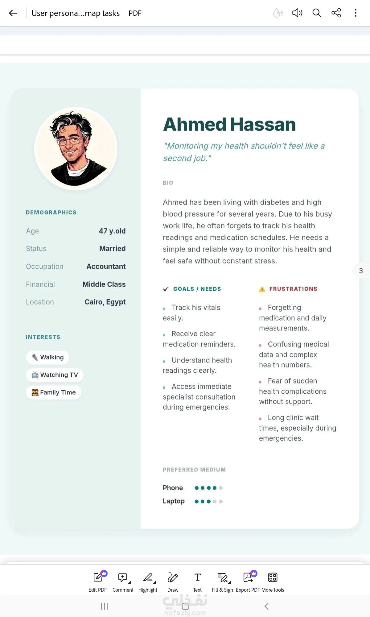 ركزت على مرحلة بحث المستخدم وفهم احتياجاته لتطبيق صحي موجه لكبار السن ومرضى الأمراض المزمنة والأشخاص المهتمة بصحتهم العامة شمل العمل إنشاء User Personas لشخصيتين مختلفتين ببيانات ديموغرافية واحتياجات وتحديات واضحة، بالإضافة إلى Empathy Maps لفهم سلوك ومشاعر المستخدم بشكل أعمق، وCustomer Journey Map لتتبع تجربة المستخدم من بداية المشكلة حتى الوصول للحل. الأداة المستخدمة: Canva