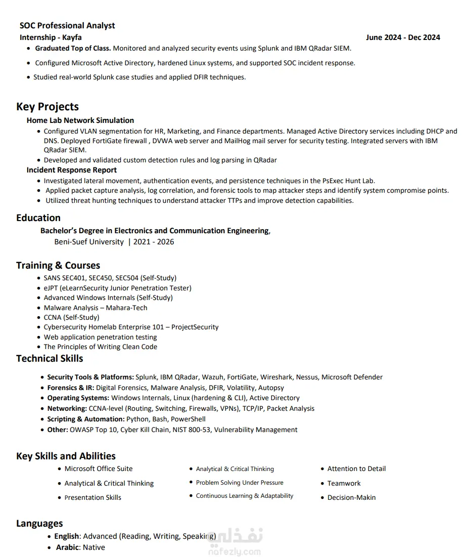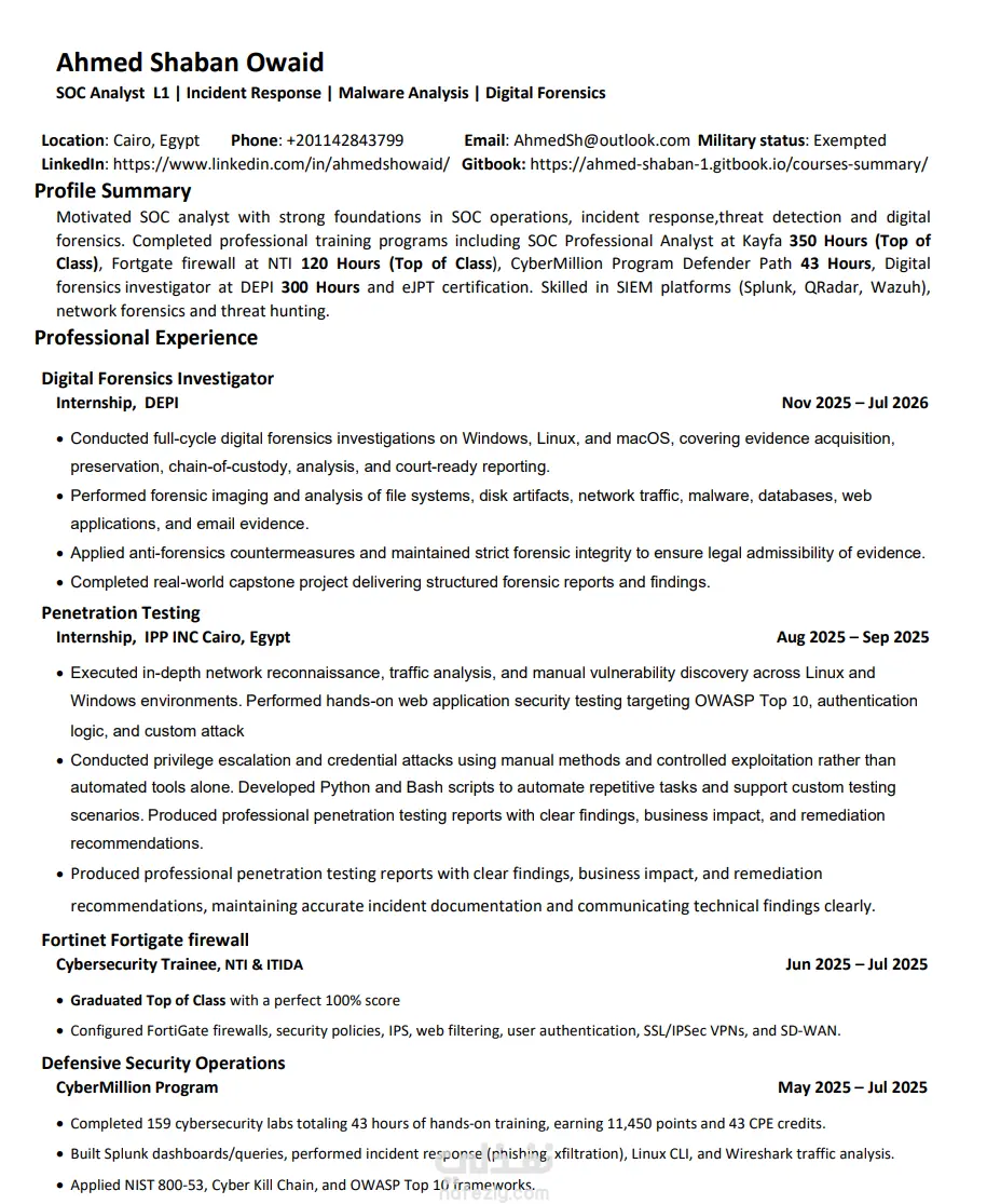 قمت بكتابة وتصميم سيرة ذاتية احترافية لأحد المتخصصين في مجال الأمن السيبراني، مبنية على فهم عميق لمتطلبات سوق العمل وأنظمة الفلترة التلقائية ATS. ───────────────────────────── التحدي: ───────────────────────────── الـ HR لا يمنح أكثر من 6 إلى 15 ثانية لقراءة أي CV، وكثير من السير الذاتية تُرفض تلقائياً قبل وصولها للـ HR بسبب عدم توافقها مع أنظمة ATS التي تستخدمها الشركات الكبيرة لتصفية المتقدمين. ───────────────────────────── ما تم تنفيذه: ───────────────────────────── - كتابة Professional Summary قوي يشد الانتباه من أول نظرة - إبراز الإنجازات بأرقام وأدلة عملية بدلاً من الكلام العام - اختيار Keywords مناسبة للمجال لضمان اجتياز فلترة ATS - تنسيق احترافي يجعل العين تتنقل بسهولة بين الأقسام - هيكل واضح ومنظم يعكس المستوى المهني الحقيقي للعميل ───────────────────────────── النتيجة: ───────────────────────────── حصل العميل على سيرة ذاتية متوافقة 100% مع أنظمة ATS تعكس شغله الحقيقي، تزيد من فرص قبوله وتضمن وصول ملفه للـ HR قبل المنافسين.