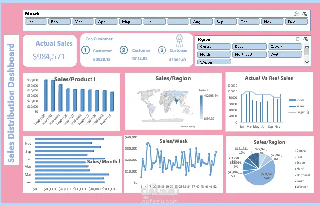 مت بعمل تنظيف للبيانات (Data Cleaning) والتعامل مع القيم المفقودة (Null Values) واستبدالها بقيم منطقية لضمان جودة البيانات. تحليل بيانات المبيعات لاستخراج أهم المؤشرات الخاصة بتوزيع المبيعات. إنشاء Pivot Tables لتحليل المبيعات حسب عدة أبعاد مثل: الشهر (Month) الأسبوع (Week) العميل (Customer) المنتج (Product) المنطقة الجغرافية (Region) حساب إجمالي المبيعات (Total Sales) وإظهار أفضل العملاء والمنتجات أداءً. تصميم Dashboard في Excel لعرض توزيع المبيعات بشكل بصري يساعد في فهم الأداء واتخاذ القرارات.