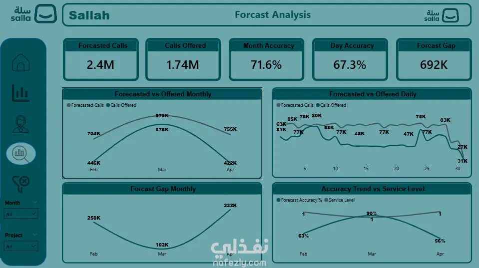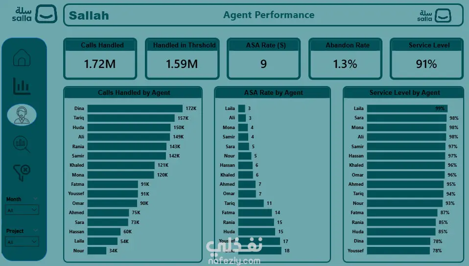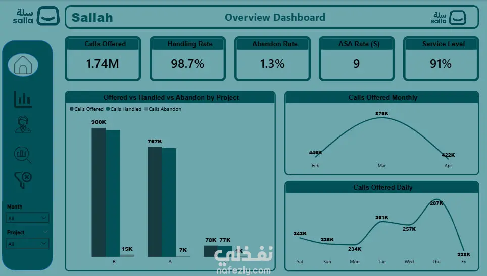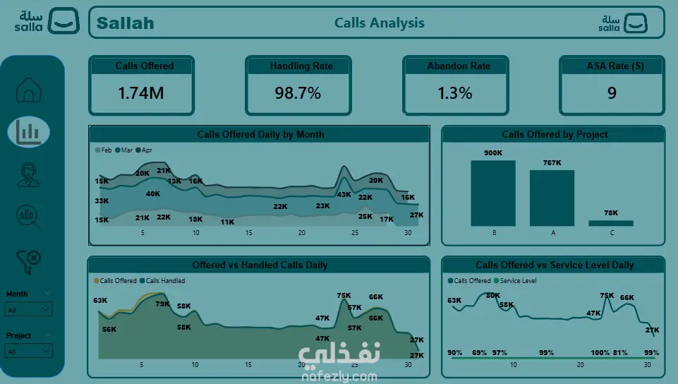 قمت بتصميم وتطوير داشبورد تفاعلي لتحليل أداء مركز خدمة العملاء لشركة Salla، بهدف تحويل البيانات التشغيلية إلى رؤى تساعد في تحسين الأداء واتخاذ قرارات فعالة. اعتمد التحليل على أكثر من 1.7 مليون مكالمة، حيث تم قياس مؤشرات الأداء الرئيسية مثل: معدل معالجة المكالمات نسبة المكالمات المتروكة (Abandon Rate) مستوى الخدمة (Service Level) متوسط وقت الرد (ASA) أظهر التحليل كفاءة تشغيلية عالية بشكل عام، مع قدرة الفريق على التعامل مع حجم المكالمات بكفاءة، لكن تم اكتشاف بعض التحديات المهمة، مثل: عدم توازن في توزيع المكالمات بين الموظفين تأثر الأداء بالزيادات المفاجئة في حجم الطلب (spikes) ضغط مرتفع على بعض الخدمات الرئيسية مما يؤثر على تجربة العملاء كما تم تحليل أداء الفريق وتقسيمه إلى فئات تشغيلية (مقترحة) بناءً على حجم العمل والكفاءة، بهدف تحسين توزيع المهام ورفع مستوى الأداء دون الحاجة لزيادة الموارد. بالإضافة إلى ذلك، تم تقييم دقة التوقعات (Forecasting)، حيث أظهرت النتائج وجود فجوة بين القيم المتوقعة والفعلية، مما يشير إلى الحاجة لتحسين نماذج التنبؤ وربطها بشكل أفضل بالقرارات التشغيلية. ساعد المشروع في تحويل البيانات إلى قرارات عملية مثل: تحسين توزيع العمل بين الفريق استغلال الطاقات غير المستخدمة الاستعداد بشكل أفضل لفترات الضغط