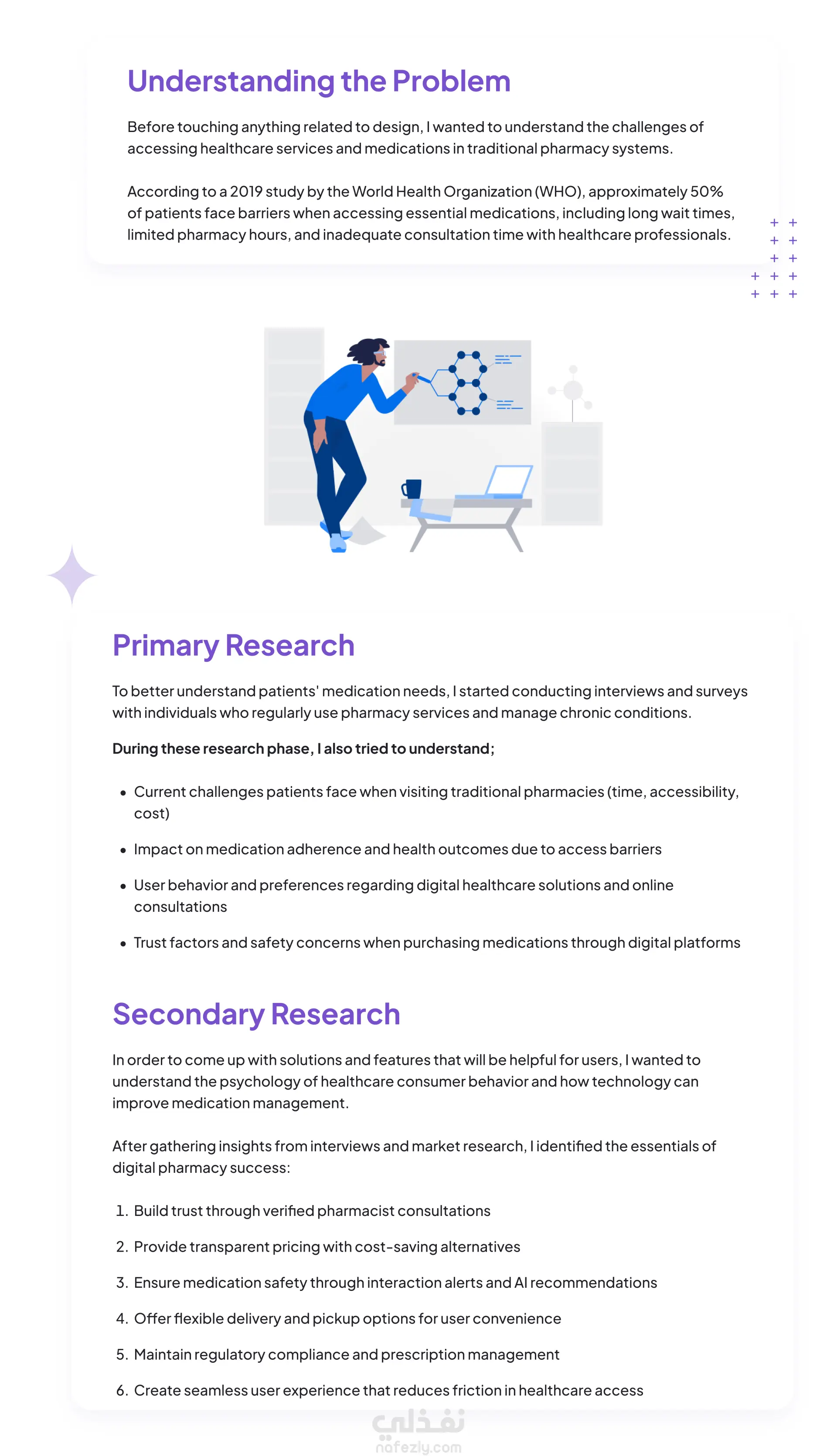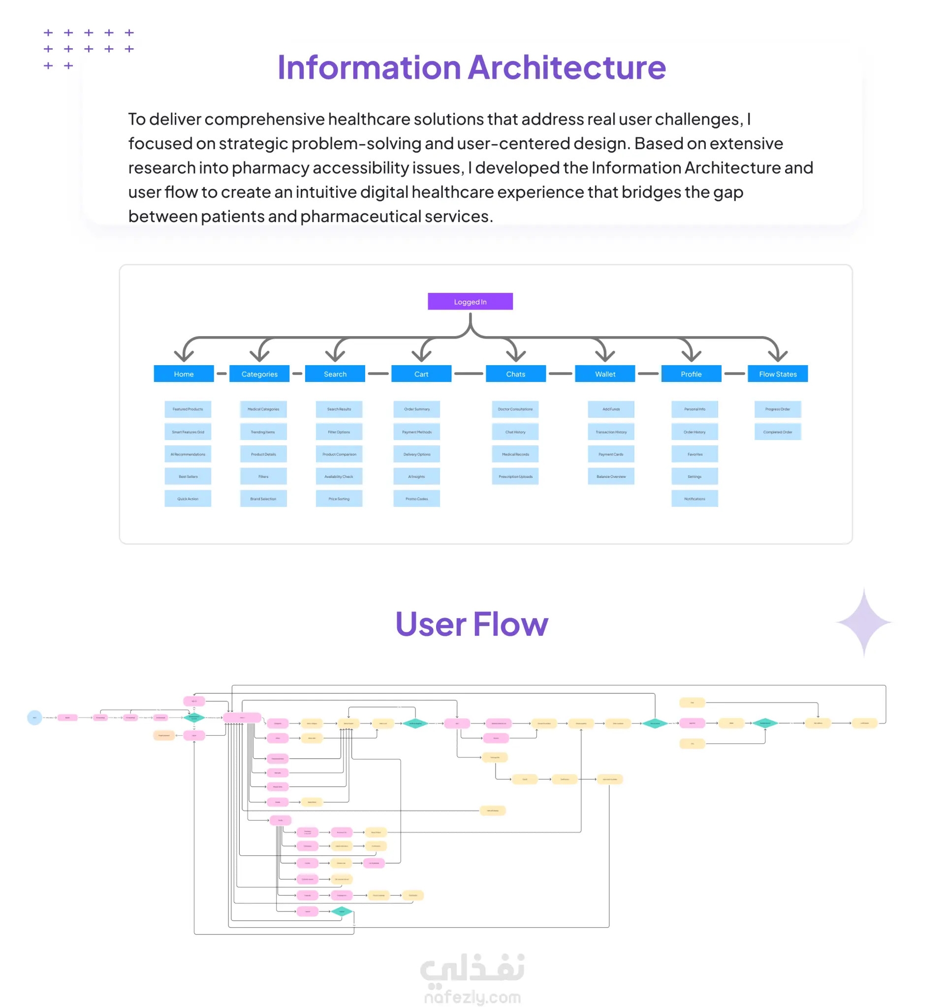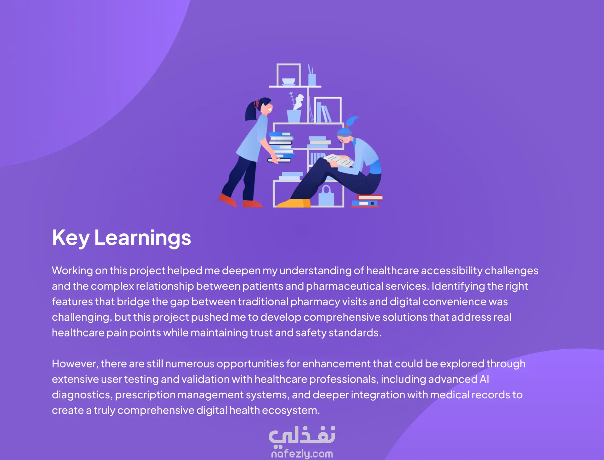 قمت بتصميم تطبيق موبايل متكامل لمنصة صيدلية رقمية كمشروع تخرج، مع التركيز على تجربة مستخدم سلسة وواجهة احترافية تخدم المرضى والمستخدمين بشكل فعال. ما تم تنفيذه: تصميم وتسليم واجهات موبايل متكاملة لمنصة صيدلية رقمية رفع تفاعل المستخدمين بنسبة 21% من خلال تحسينات UX وA/B Testing إجراء User Research وUsability Testing لتحسين أداء المنتج بناء Design System متكامل في Figma قلل وقت التطوير بنسبة 30% تطبيق Design Thinking لضمان تجربة مستخدم محورية وفعالة