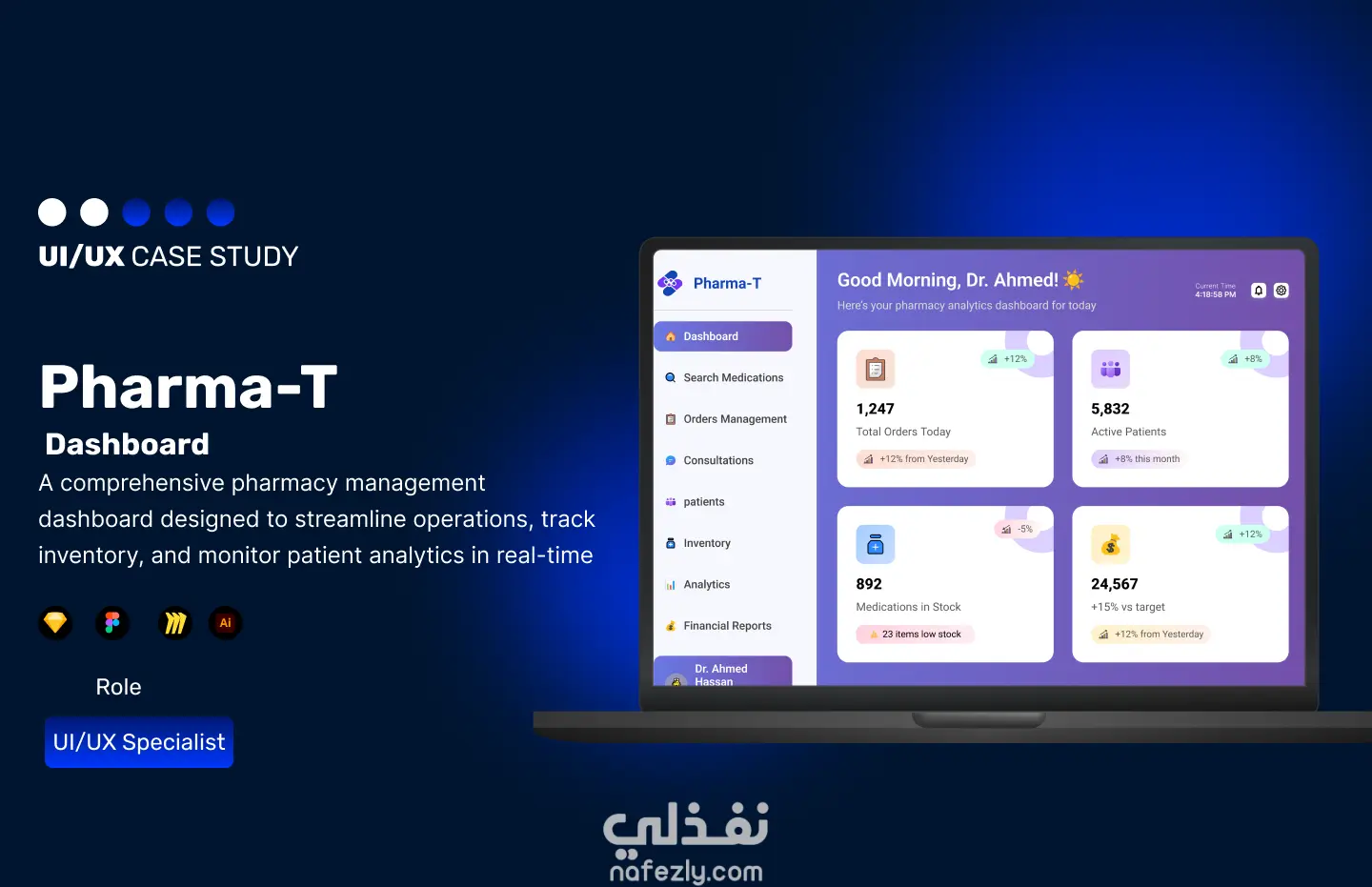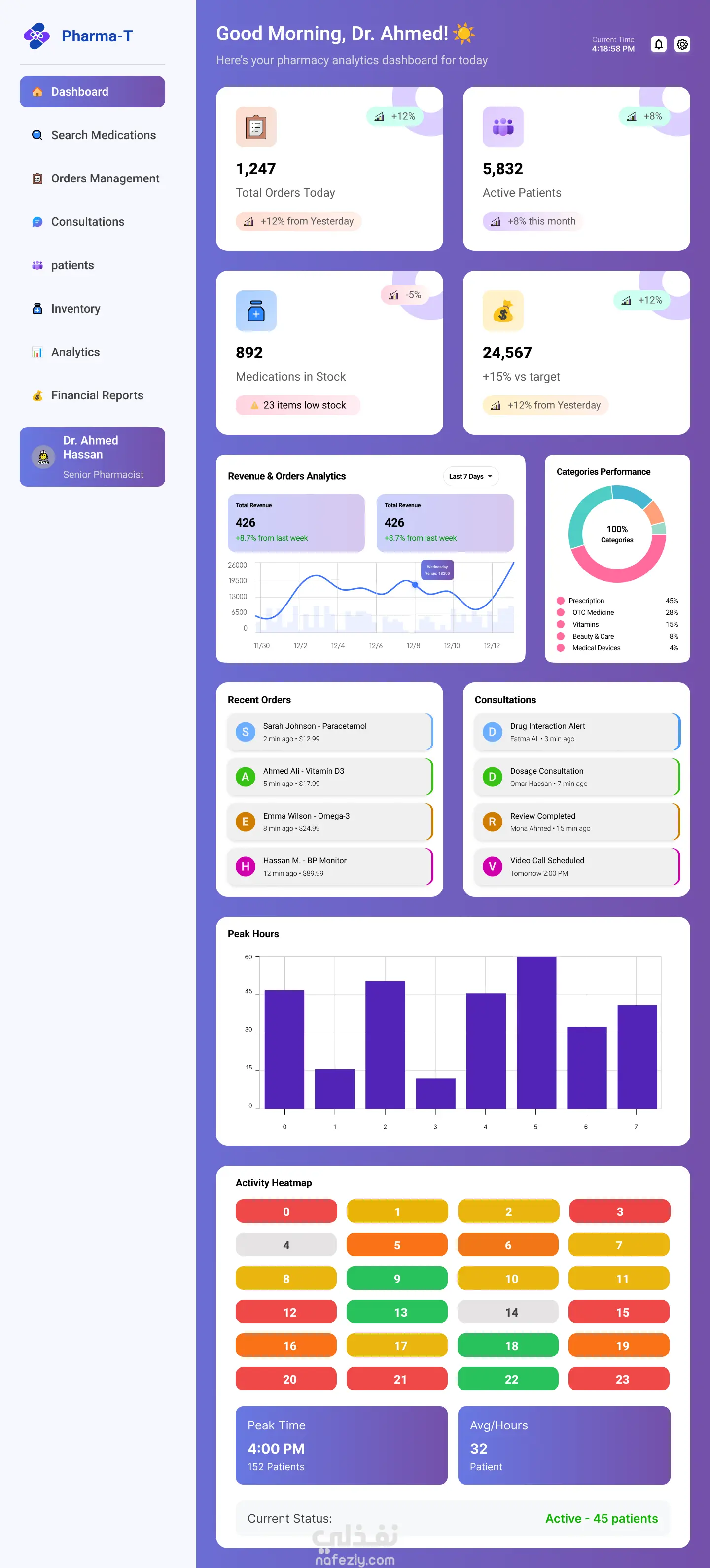 قمت بتصميم Dashboard متكامل لمنصة صحية وصيدلانية احترافية، مع التركيز على وضوح البيانات وسهولة الاستخدام لفريق العمل الطبي والإداري.