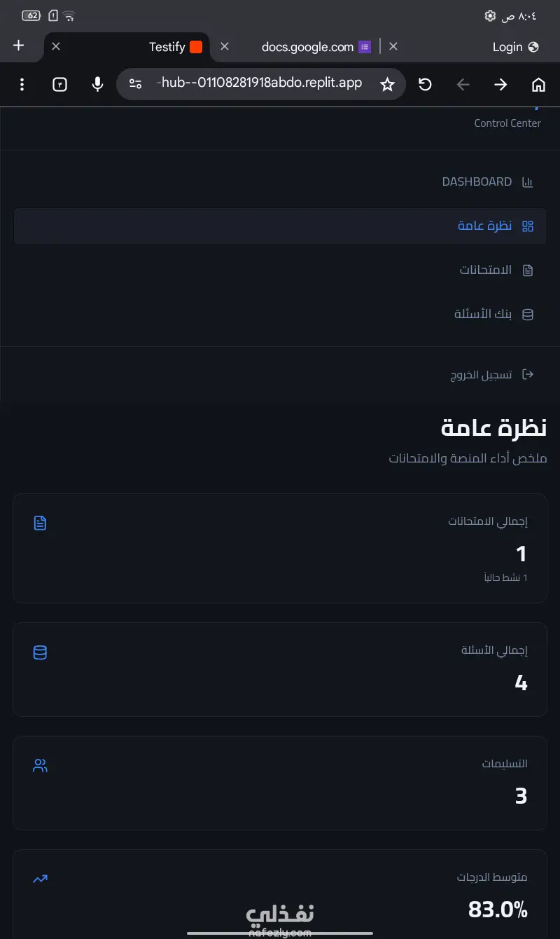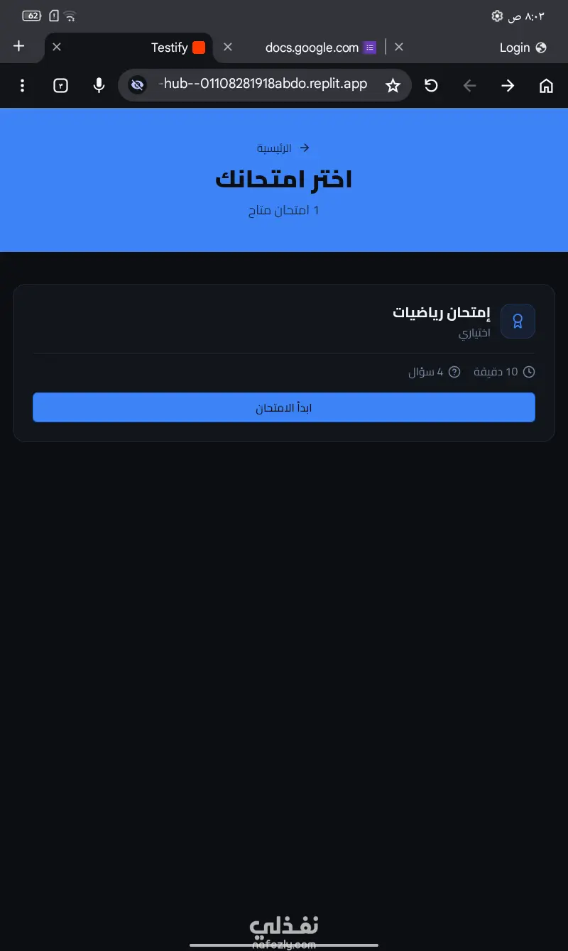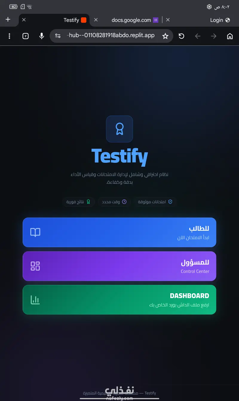 منصة "Testify" الاحترافية لإدارة الاختبارات أونلاين هل تبحث عن نظام متكامل وسهل الاستخدام لعمل الاختبارات وتصحيحها تلقائياً؟ أقدم لك منصة Testify، الحل الأمثل للمدرسين، الأكاديميات، أو حتى الشركات لتقييم الطلاب والموظفين بكل سهولة واحترافية. ما الذي ستحصل عليه مقابل الخدمة؟ عند شرائك لهذه الخدمة، ستحصل على نسخة كاملة من المنصة تشمل: لوحة تحكم كاملة: لإدارة الأسئلة، الطلاب، والنتائج بسهولة. نظام تصحيح تلقائي: تظهر النتيجة للطالب فور الانتهاء من الاختبار. دعم أنواع مختلفة من الأسئلة: (اختيار من متعدد، صح وغلط، وغيرها). واجهة مستخدم بسيطة وسريعة: تدعم جميع الأجهزة (موبايل، تابلت، كمبيوتر). مميزات المنصة: تنظيم المجهود: توفير الوقت الضائع في التصحيح اليدوي. تقارير دقيقة: الحصول على تحليل كامل لمستوى كل طالب. حماية الخصوصية: نظام تسجيل دخول آمن لكل طالب. تخصيص كامل: إمكانية تعديل اسم المنصة وشعارها بما يناسبك.