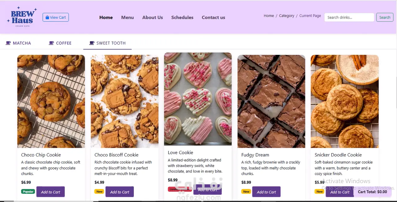 * قائمة ديناميكية للتنقل بين القهوة والمعجنات والعروض