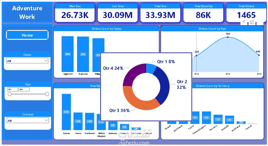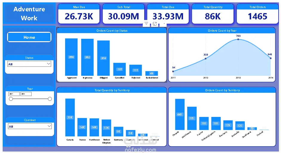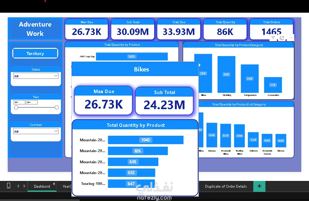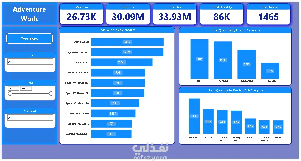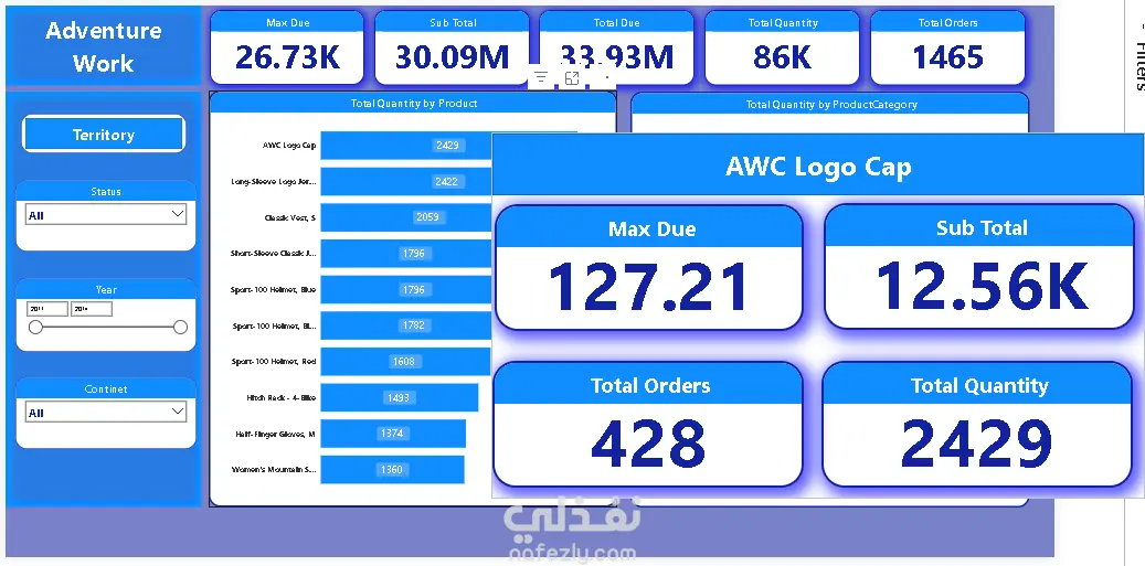 مشروع متكامل (من البداية للنهاية) لتحويل بيانات شركة "Adventure Works" الخام إلى نظام تقارير ذكي. لا يقتصر هذا العمل على التصميم المرئي فحسب، بل يشمل بناء نموذج بيانات قوي (Star Schema) يربط بين المبيعات، المنتجات، الأقاليم الجغرافية، وحالة الطلبات لتقديم رؤية شاملة لأداء العمليات. ما يميز هذا المشروع (الجانب التقني): نمذجة البيانات (Data Modeling): بناء نموذج بيانات احترافي يعتمد على علاقات (One-to-Many) وجداول الأبعاد والحقائق، مما يضمن سرعة استجابة التقارير ودقة النتائج. تصميم الـ Tooltips الديناميكية: ابتكار نوافذ منبثقة (Pop-up windows) تظهر عند التمرير فوق أي عنصر، لعرض تفاصيل إضافية مثل (توزيع المبيعات الربع سنوي أو أداء فئات معينة) دون مغادرة الصفحة الرئيسية. تحليل الأقاليم والمنتجات: تتبع المبيعات عالمياً (كندا، فرنسا، ألمانيا، أستراليا...) مع تحليل دقيق لأكثر الفئات مبيعاً (مثل الدراجات والملابس). مؤشرات الأداء التشغيلي: مراقبة حالة الطلبات (Approved, Shipped, Cancelled) لتحديد نقاط الخلل في سلاسل الإمداد. التصميم المرتكز على المستخدم (User-Centric Design): استخدام ألوان متناسقة، قوائم جانبية سهلة التنقل، وأزرار تفاعلية تمنح المستخدم شعوراً بأنه يستخدم تطبيقاً ذكياً وليس مجرد تقرير جامد. المهارات والمقاييس المستعرضة: Advanced DAX: حساب قيم معقدة مثل (Max Due, Sub Total, Order Counts). Data Visualization: استخدام مخططات متنوعة (Line Charts, Funnel Charts, Donut Charts). Business Intelligence: الربط بين أهداف العمل والبيانات التقنية.