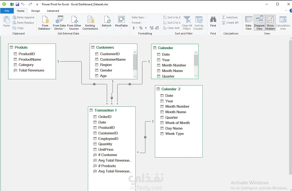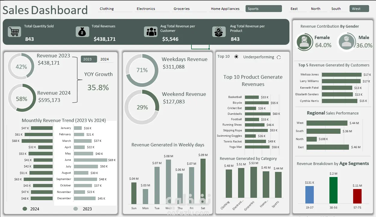تطوير لوحة تحكم تفاعلية متكاملة تهدف إلى تحسين الكفاءة التشغيلية وزيادة الربحية لمجموعة مطاعم. يركز المشروع على الربط بين سلوك العميل (Customer Behavior) والأداء الزمني للمبيعات، مما يسمح لإدارة المطعم باتخاذ قرارات مبنية على البيانات فيما يخص قائمة الطعام (Menu Engineering) وتوزيع العمالة. النقاط التحليلية التي تم تنفيذها: تحليل المبيعات المقارن (Growth Analytics): رصد معدل النمو السنوي (YOY Growth) بنسبة 35.8%، مع مقارنة بصرية دقيقة بين أداء العام الحالي والسابق لتحديد اتجاهات السوق. هندسة قائمة الطعام (Menu Engineering): تحليل أفضل 10 أصناف مبيعاً (Top 10 Products) لتحديد "الأصناف النجمة" التي تحقق أعلى العوائد، مع إمكانية تبديل العرض لمراقبة الأصناف الأقل أداءً (Underperforming) لاتخاذ قرار بشأن تعديلها أو حذفها. تحليل الفترات الزمنية والذروة: مراقبة الإيرادات خلال أيام الأسبوع (Weekdays vs Weekends) لتحديد فترات الذروة، مما يساعد في جدولة الموظفين وتقليل تكاليف العمالة غير الضرورية. تحليل المبيعات اليومية (من الأحد للسبت) لتوضيح أنماط الطلب. التقسيم الديموغرافي للعملاء: تحليل الإيرادات بناءً على النوع الاجتماعي (Gender Contribution) والفئات العمرية، مما يساهم في تصميم عروض ترويجية مستهدفة (مثلاً: استهداف فئة الشباب بعروض محددة بناءً على تفضيلاتهم). كفاءة الفروع والمناطق: مقارنة أداء الفروع في المناطق المختلفة (East, West, North, South) لتحديد المناطق التي تحتاج لتدخل تسويقي أو تحسين جودة الخدمة. المهارات التقنية والقيمة المضافة: تجريد البيانات المعقدة: تحويل آلاف المعاملات اليومية إلى مؤشرات بسيطة مثل "متوسط العائد لكل عميل". واجهة مستخدم احترافية: استخدام تنسيق ألوان هادئ ومنظم يركز على الأرقام الحيوية أولاً. المرونة (Dynamic Filtering): توفير فلاتر علوية لفرز البيانات حسب نوع الطعام (Clothing, Electronics - يمكن استبدالها هنا بـ Pizza, Burgers, Drinks) والموقع الجغرافي.