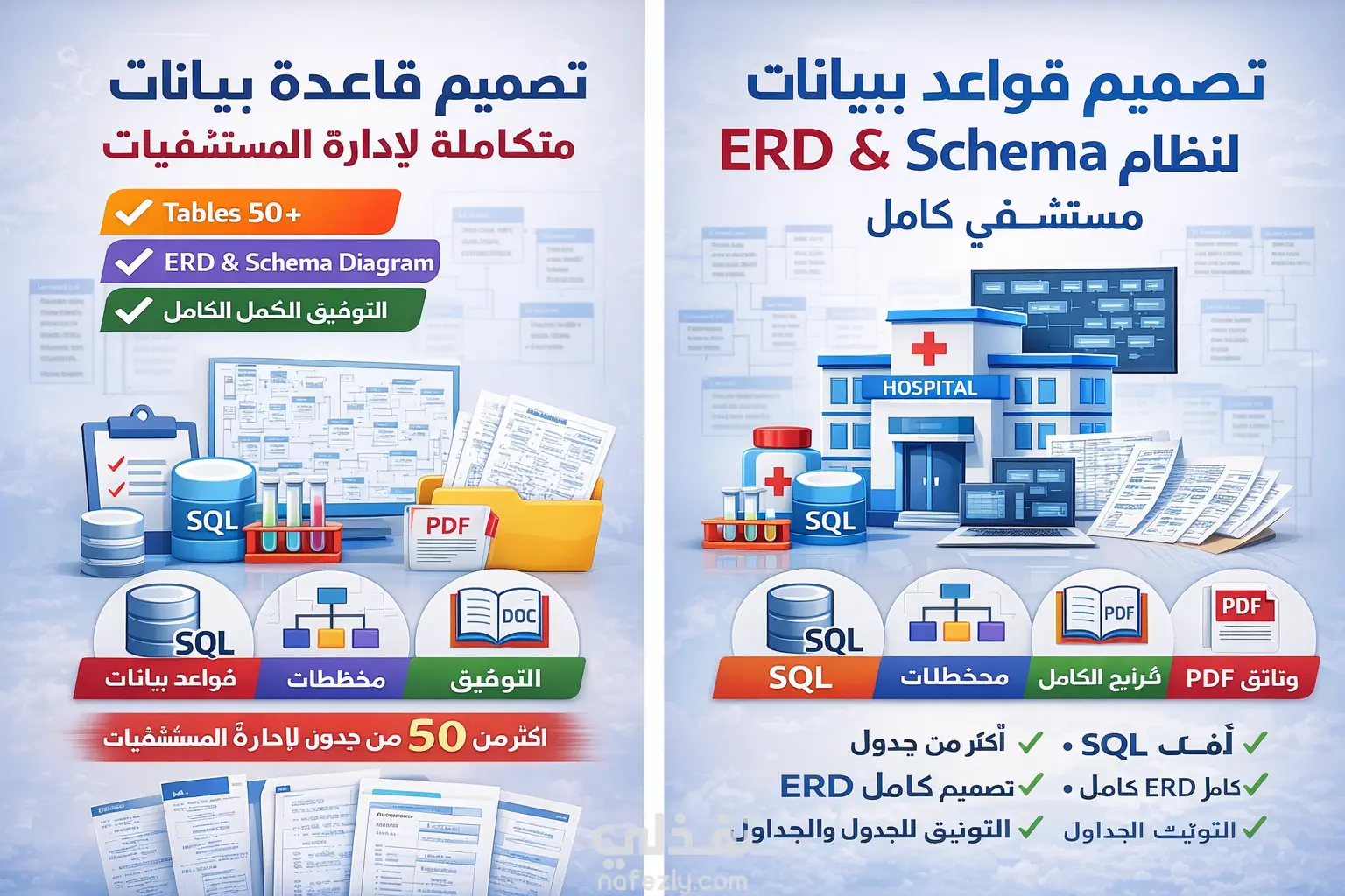 أقدم خدمة تصميم قاعدة بيانات احترافية لنظام إدارة المستشفيات باستخدام أفضل ممارسات تصميم قواعد البيانات. يتضمن المشروع تصميم قاعدة بيانات كاملة تحتوي على أكثر من 50 جدول لإدارة جميع العمليات داخل المستشفى مثل المرضى والأطباء والمواعيد والسجلات الطبية والفواتير والموظفين. تم تصميم المشروع باستخدام نموذج ERD (Entity Relationship Diagram) ثم تحويله إلى Relational Database Schema مع توثيق كامل لكل الجداول والعلاقات بينها. تشمل قاعدة البيانات عدة أنظمة فرعية مثل: إدارة المرضى (Patients Management) إدارة الأطباء والتخصصات (Doctors & Specialties) إدارة المواعيد (Appointments System) السجلات الطبية (Medical Records) الوصفات الطبية (Prescriptions) الفحوصات المعملية (Laboratory System) الأشعة (Radiology System) إدارة الغرف والأسرة (Rooms & Beds) نظام الفواتير والمدفوعات (Billing & Payments) إدارة الموظفين والمناوبات (Staff & Shifts) إدارة الصيدلية والمخزون (Pharmacy & Inventory) كما يحتوي المشروع على توثيق كامل لكل الجداول والخصائص والعلاقات بالإضافة إلى تحديد: Primary Keys Foreign Keys Relationships Participation Cardinality هذا المشروع مناسب لـ: مشاريع قواعد البيانات في الجامعة مشاريع التخرج بناء أنظمة إدارة مستشفيات تعلم Database Design و ERD Modeling