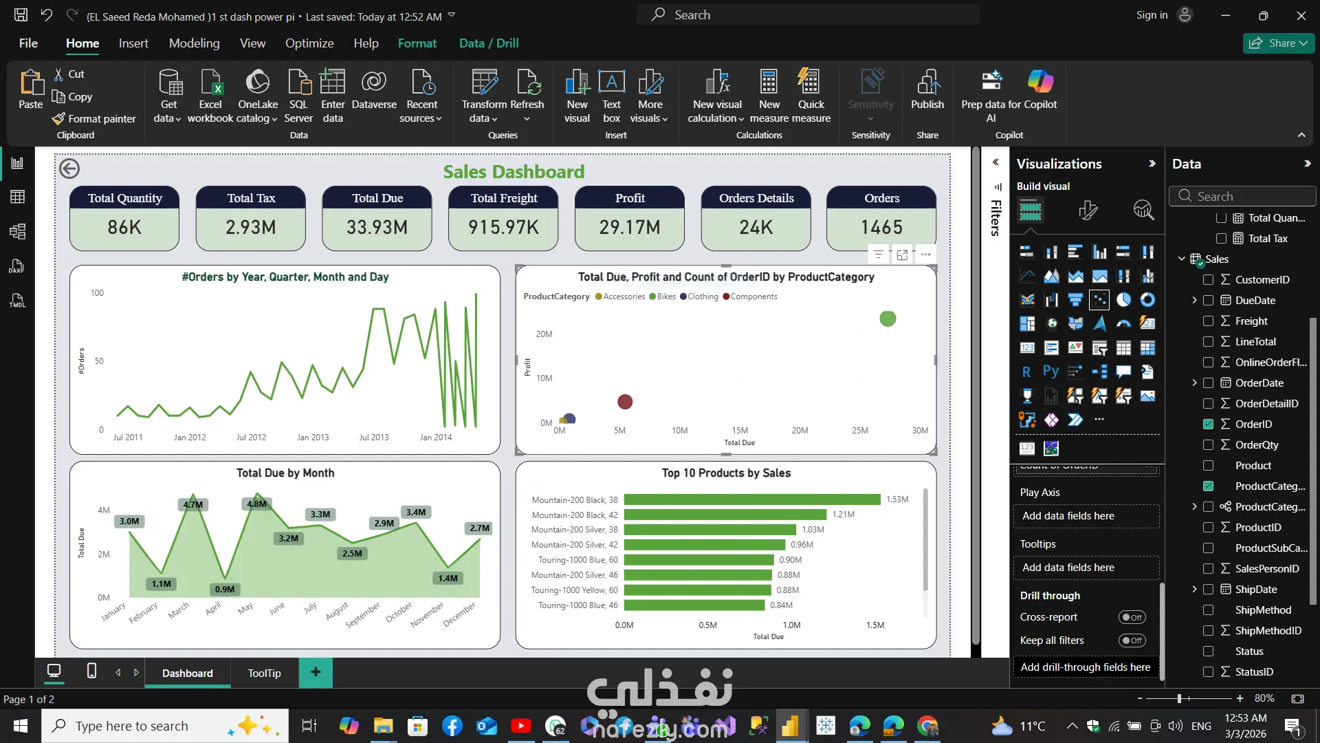 تصميم داشبورد تفاعلي لتحليل بيانات المبيعات باستخدام Microsoft Power BI، بدايةً من تنظيف البيانات وتحويلها في Power Query، ثم بناء نموذج البيانات، وإنشاء المقاييس (KPIs) باستخدام DAX.