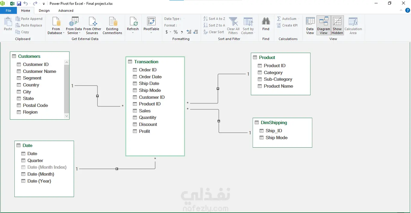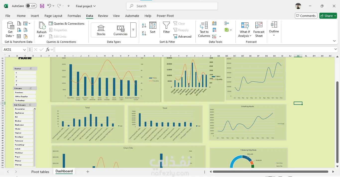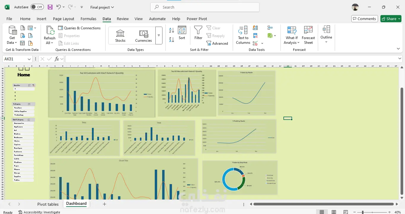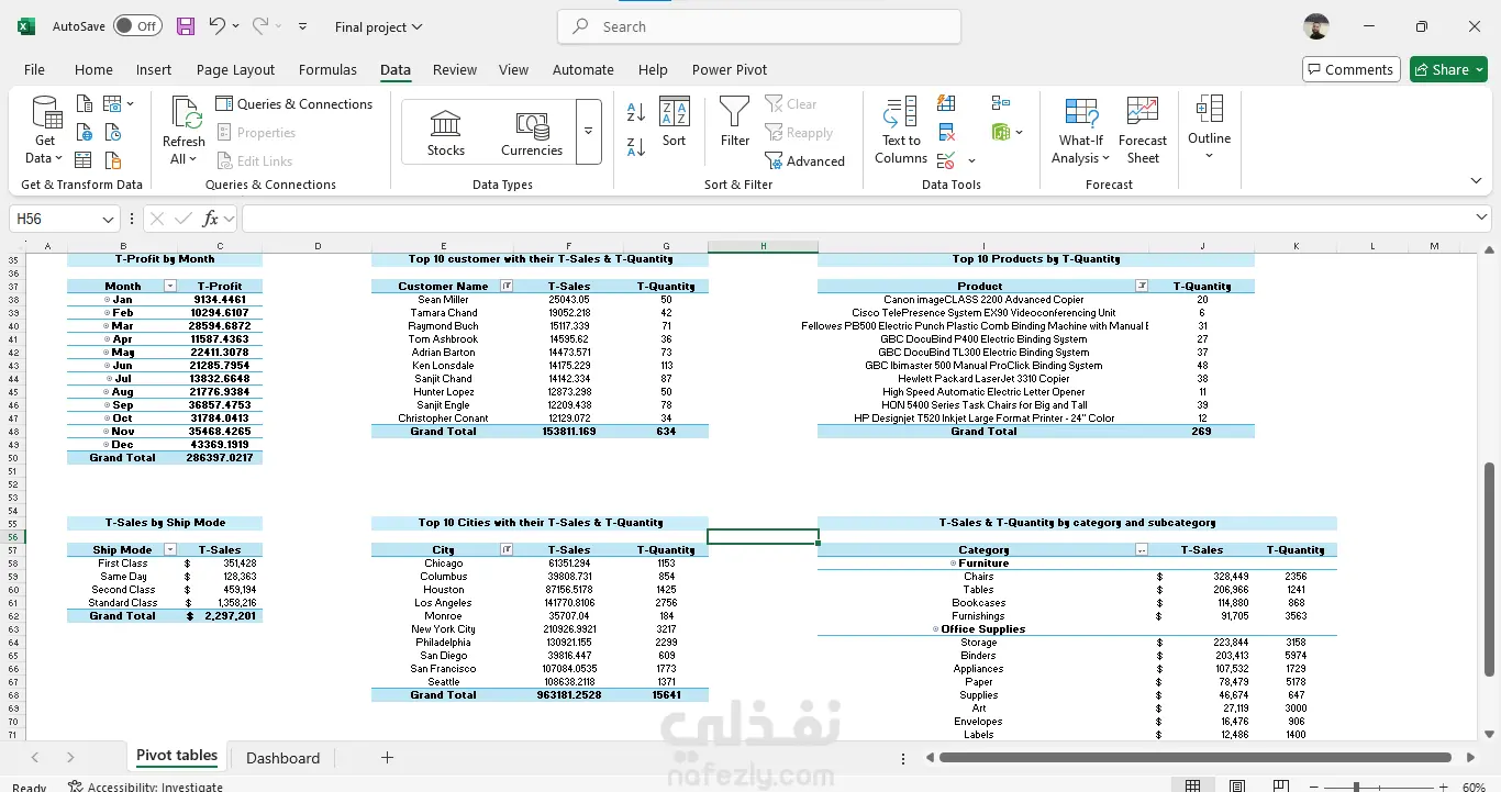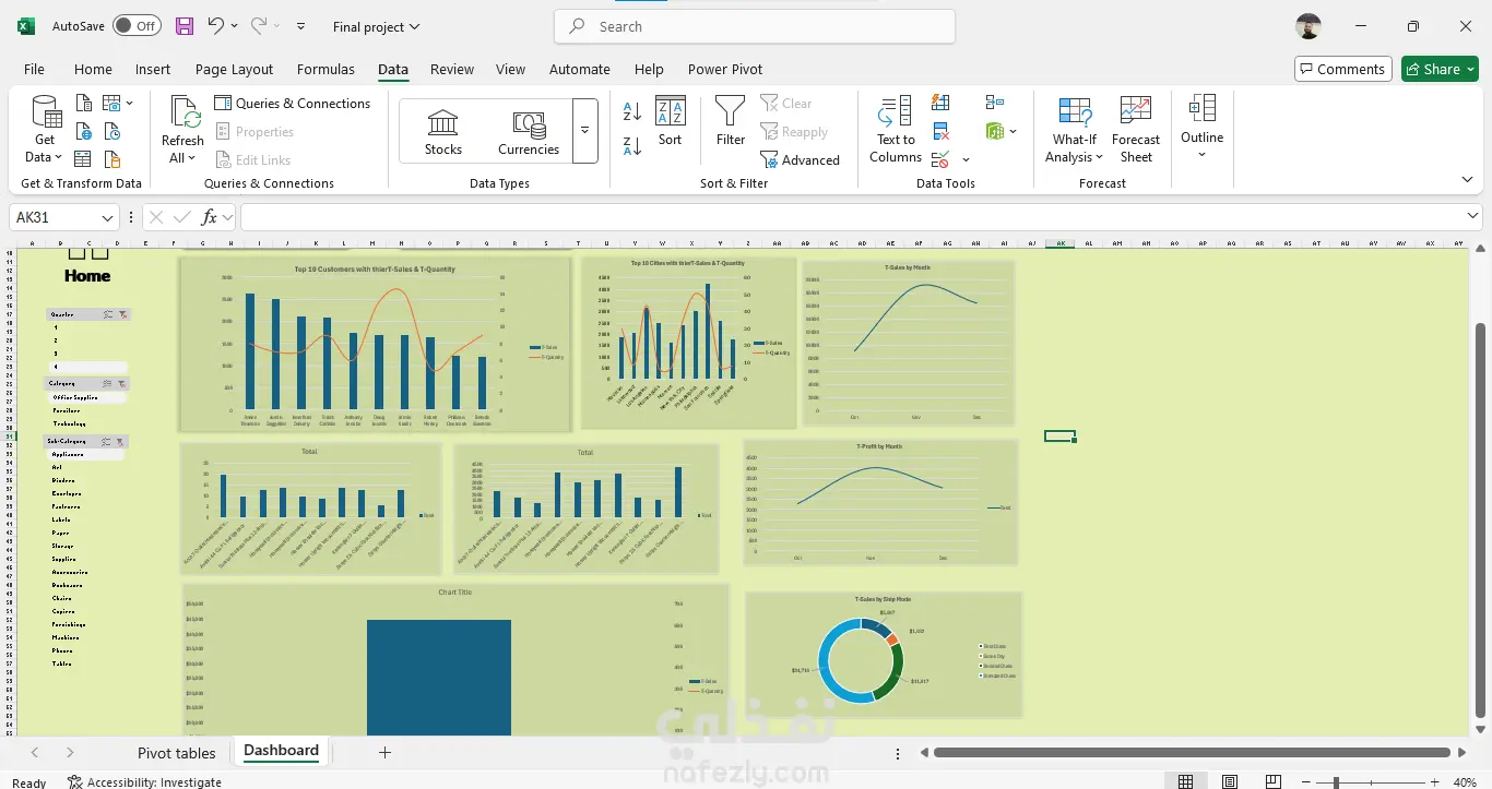 تشمل الخدمة: تنظيف البيانات وإعدادها باستخدام Power Query، بناء نموذج بيانات علائقي يربط جميع الجداول، إنشاء Pivot Tables ومخططات تفاعلية، لوحة تحكم رئيسية مع Slicers للتصفية حسب الفئة والربع، وتحليل المبيعات والعملاء والمنتجات وطرق الشحن.