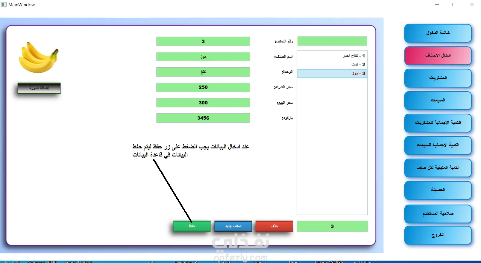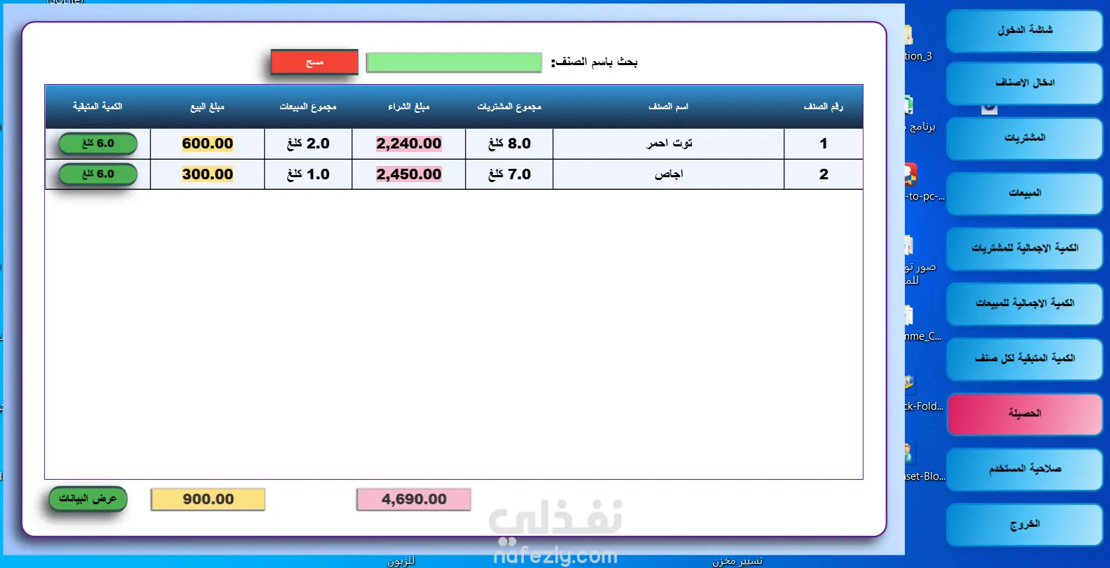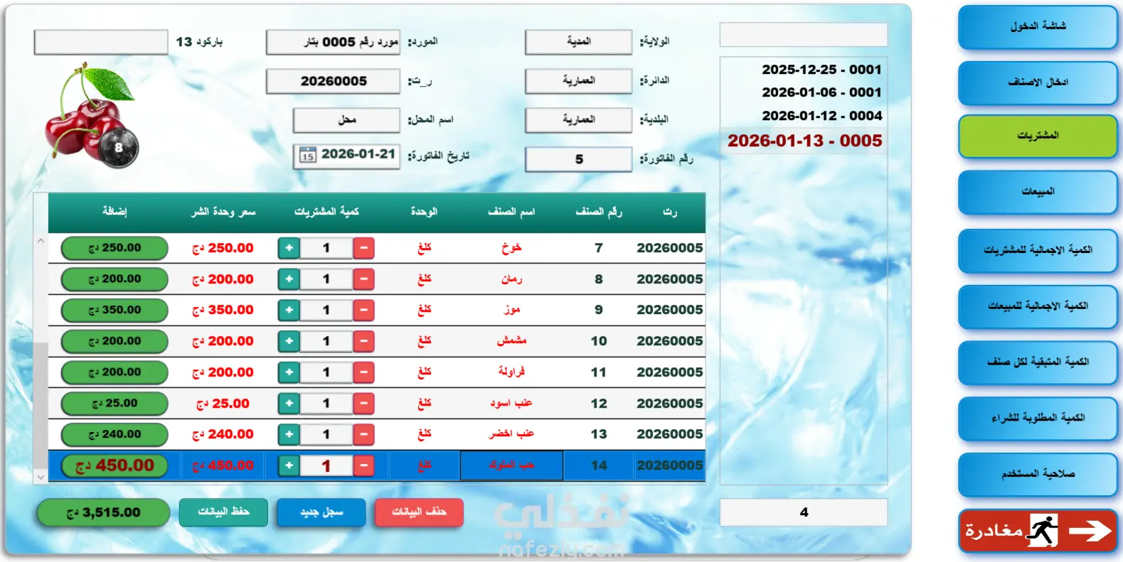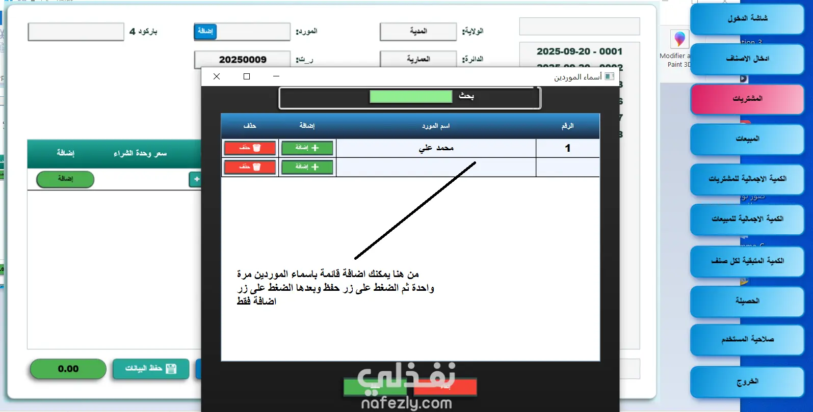 الصفحة الاولى خاصة بادخال الاصناف والصفحة الثانية خاصة بالمشتريات والصفحة الثالثة خاصة بالمبيعات و اما اسم المستخدم حكيم وكلمة المرور 1