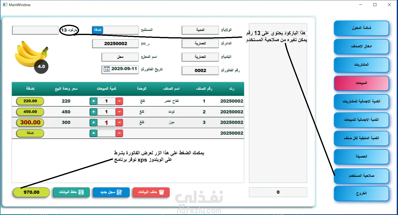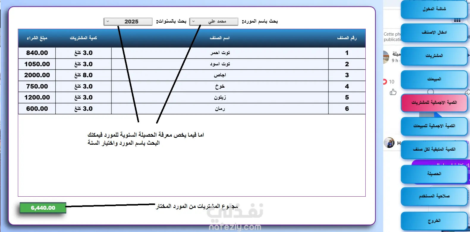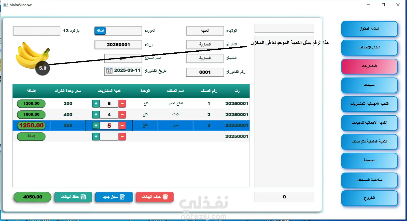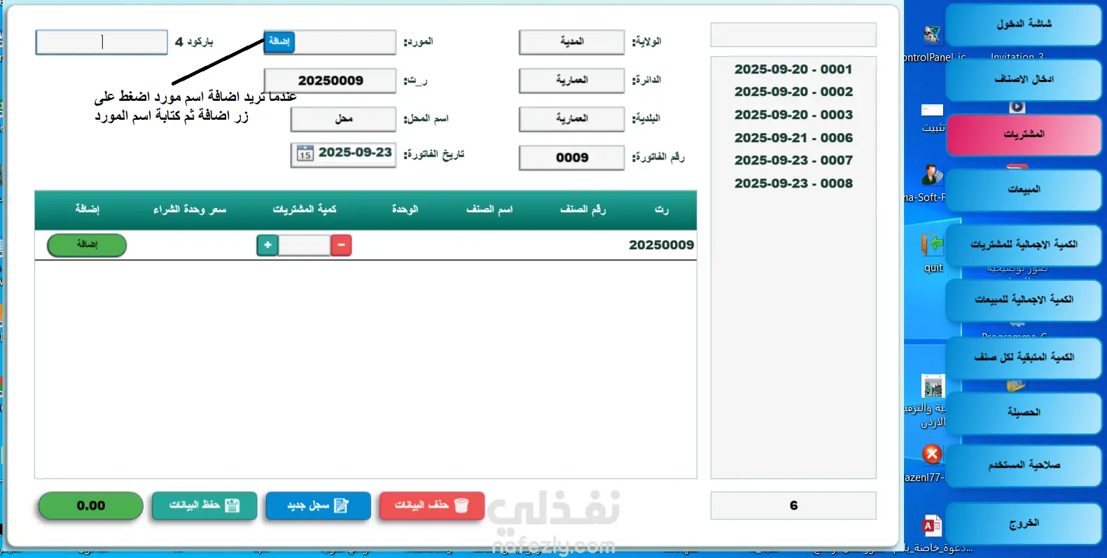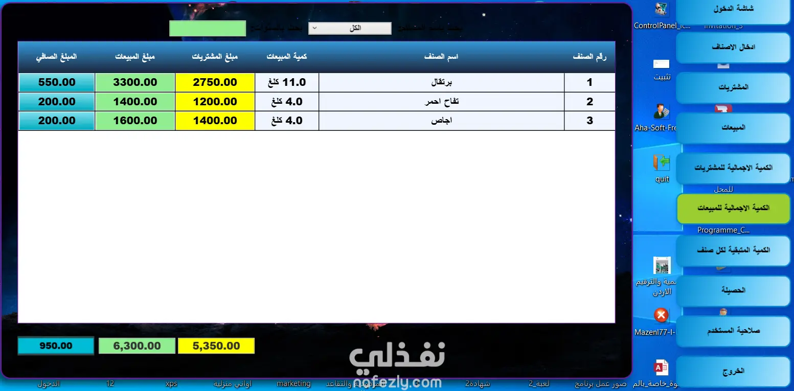 الصفحة الاولى خاصة بادخال الاصناف والصفحة الثانية خاصة بالمشتريات والصفحة الثالثة خاصة بالمبيعات و اما اسم المستخدم حكيم وكلمة المرور 1
