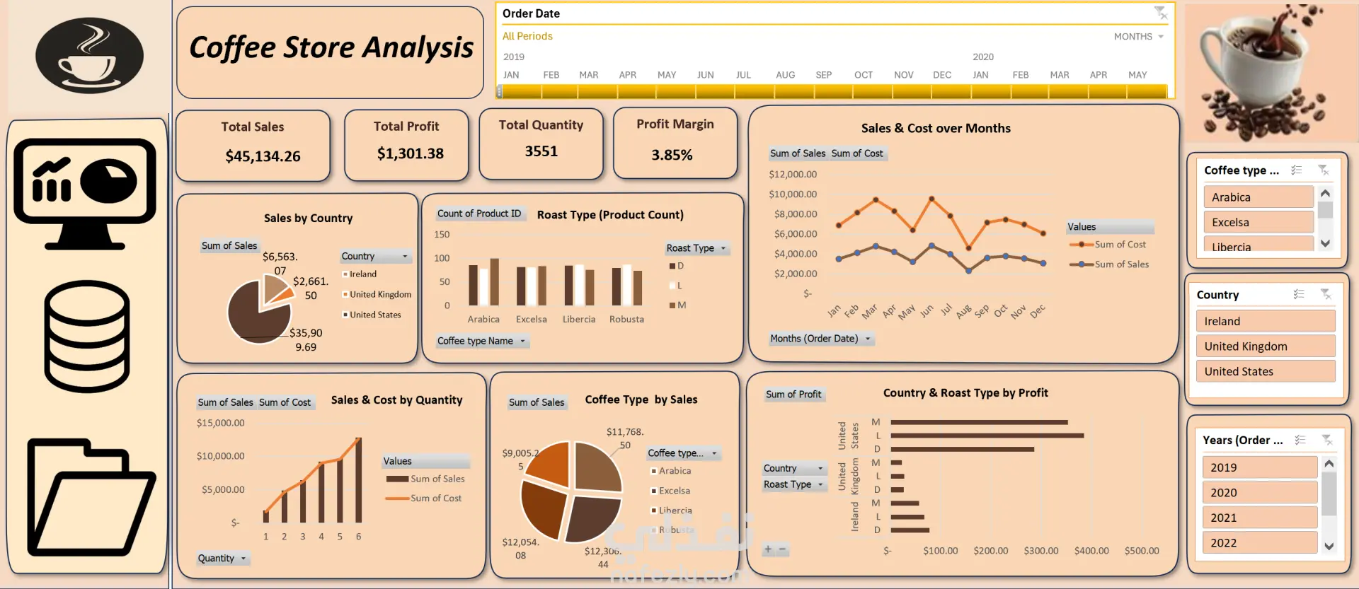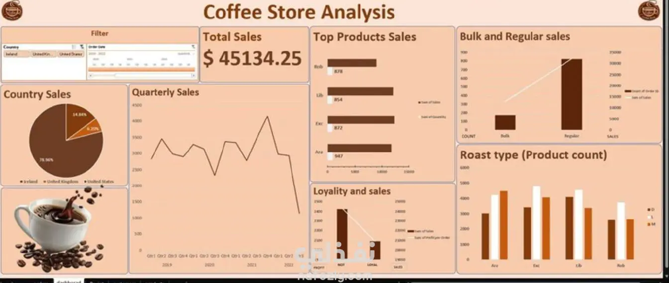 قمت ببناء نظام تحليل بيانات متكامل لمتجر قهوة، حولت من خلاله أكثر من 3,500 طلب إلى رؤى استراتيجية. ساعد المشروع الإدارة على تتبع كيف تحولت مبيعات بقيمة 45,000 دولار إلى أرباح صافية، مع تحديد السوق الأمريكي كأقوى سوق بمبيعات وصلت لـ 35,000 دولار.