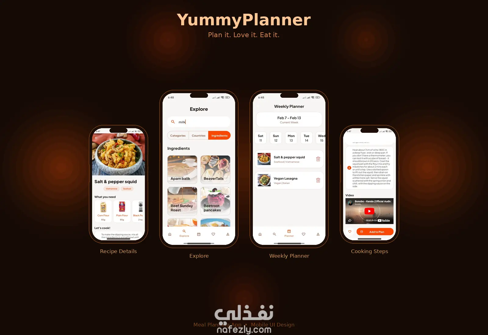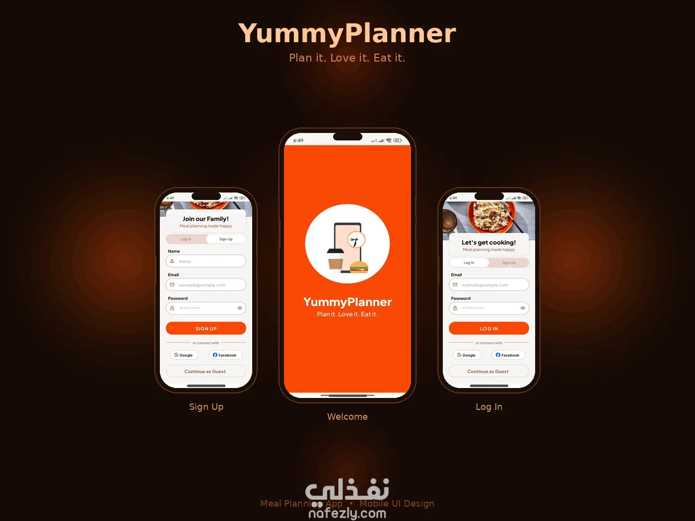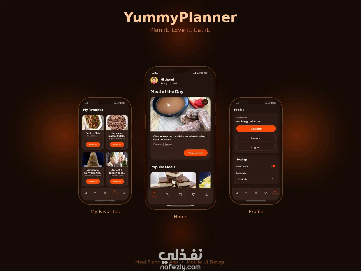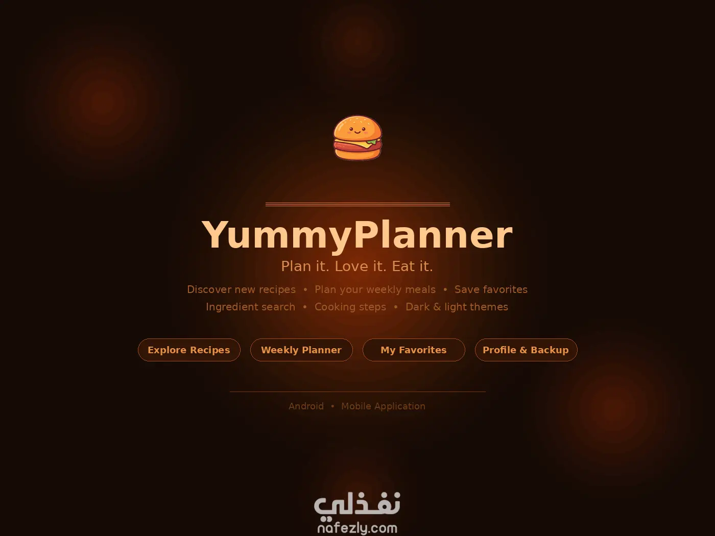 يمكن حفظ الوصفات في Favorites وتنظيم الوجبات عبر Meal Planner. يدعم User Accounts باستخدام Firebase Authentication مع توفر Guest Mode. كما يوفر Dark Theme ويدعم Localization بالعربية والإنجليزية.