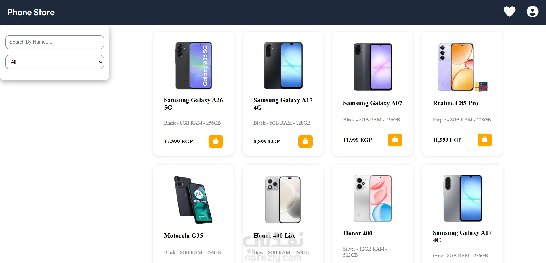 واجهة متجر موبايلات متجاوبة تعرض المنتجات بشكل ديناميكي، مع إمكانية البحث والتصفية حسب السعر. يتضمن ميزات مثل قائمة المفضلة وصفحات الحساب، مع التركيز على بناء واجهات تفاعلية باستخدام JavaScript وإدارة البيانات على جانب المستخدم.