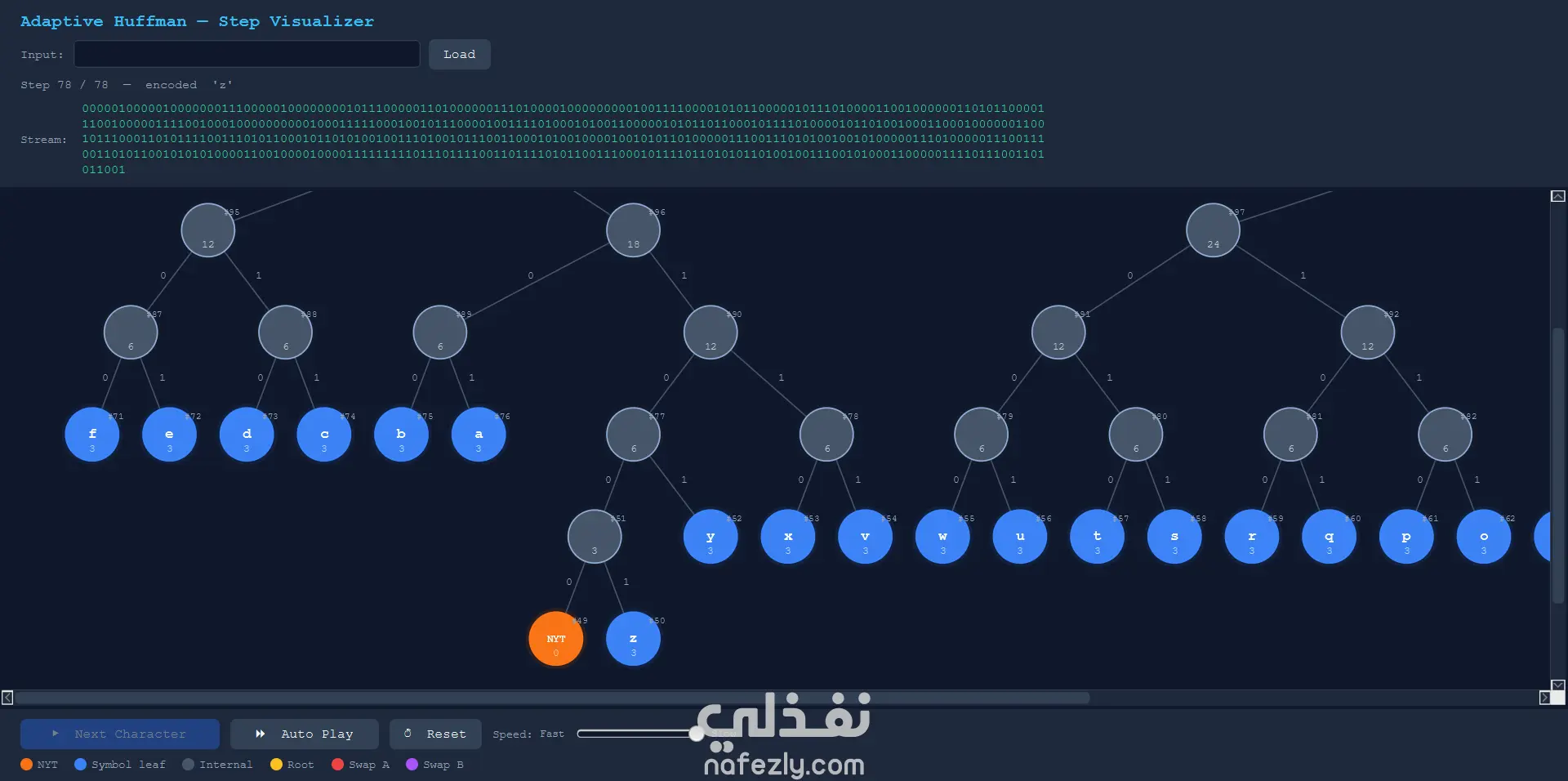 مشروع متكامل بلغة Java لتنفيذ خوارزمية Adaptive Huffman Coding (المعروفة بـ Dynamic Huffman) للتعامل مع تدفق البيانات المباشر (Data Streams). المميزات التقنية المنفذة: • خوارزمية ديناميكية عالية الكفاءة: تنفيذ كامل لعمليات ترميز (Encoding) وفك تشفير (Decoding) متزامنة، حيث يتم تحديث شجرة الـ Huffman عند الطرفين دون الحاجة لإرسال جدول الترددات، مما يوفر مساحة تخزينية إضافية. • نظام المحاكاة المرئي (Visualizer): تطوير واجهة رسومية باستخدام JavaFX تتيح للمستخدمين تتبع تطور الشجرة خطوة بخطوة أثناء معالجة كل رمز، مع توضيح عمليات الـ Sibling Property Swaps ورموز الـ NYT (Not Yet Transmitted). • إدارة متقدمة للبيانات: استخدام هياكل بيانات (Data Structures) مخصصة مثل الأشجار الثنائية (Binary Trees) و HashMaps لضمان سرعة الوصول والتحديث للعقد (Nodes) بترقيد زمني (Time Complexity) فعال. النتائج المحققة: يستطيع النظام ضغط السلاسل النصية المتكررة بكفاءة عالية، مع ضمان استرجاع البيانات الأصلية بنسبة 100% (Lossless Compression).