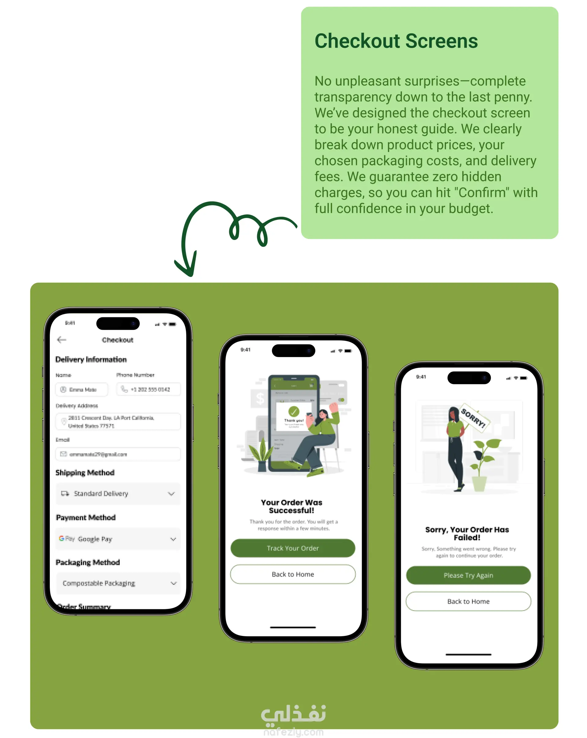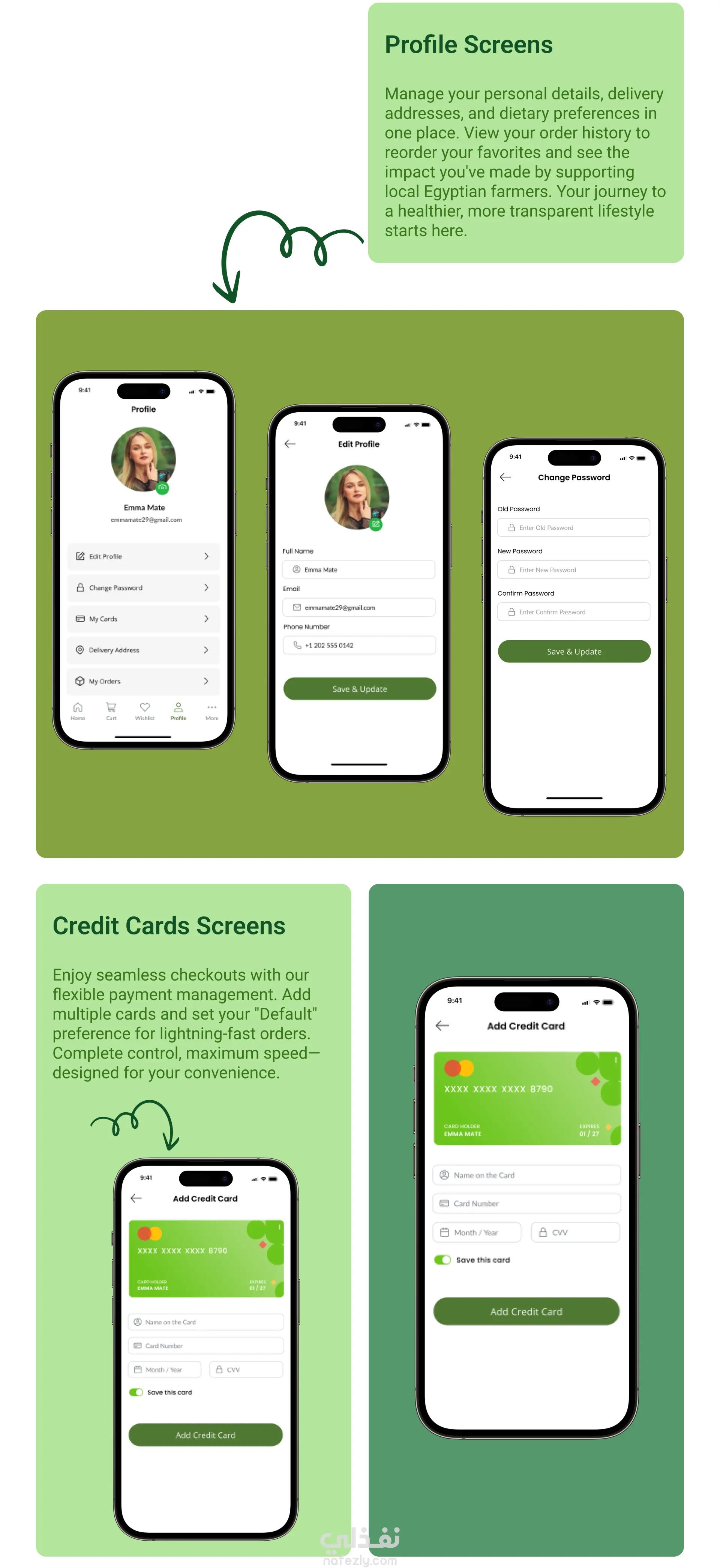 Fresh Harvest هو تطبيق عصري لشراء الخضار والفاكهة الطازجة عبر الإنترنت وتوصيلها مباشرة إلى باب المنزل. صُمم ليقدّم تجربة تسوّق سهلة، سريعة، ومرنة، وممتعة مع واجهة جذابة وبسيطة تركز على راحة المستخدم ، مع التركيز على تقديم المنتجات بأعلى جودة وبأقصر وقت توصيل. ركز التصميم على تصميم واجهة استخدام حديثة وبديهية تسهّل على المستخدمين: استكشاف أصناف الخضار والفاكهة بسرعة. طلب المنتجات بخطوات بسيطة وسريعة وسلسة بدون تعقيد. متابعة حالة الطلب بكل سهولة. سهولة تصفّح المنتجات والتصنيفات. عرض جذّاب للمنتجات بصور واقعية وأسعار واضحة. ألوان مريحة توحي بالنضارة والطبيعة مع لمسة طبيعية تعزز الشعور بالنضارة والثقة. استخدمت لوحة ألوان مستوحاة من الطبيعة (درجات الأخضر والأبيض) مع عناصر تصميمية مستديرة لإضفاء طابع ودي ومريح.
