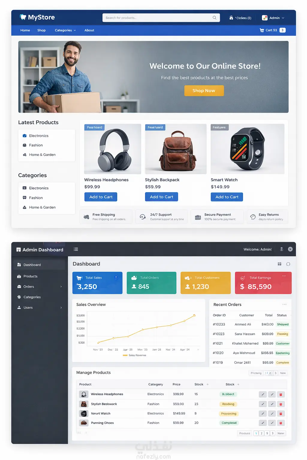 يحتوي النظام على لوحة تحكم (Admin Dashboard) لإدارة المنتجات والطلبات والتصنيفات، بالإضافة إلى نظام تسجيل دخول باستخدام ASP.NET Identity.