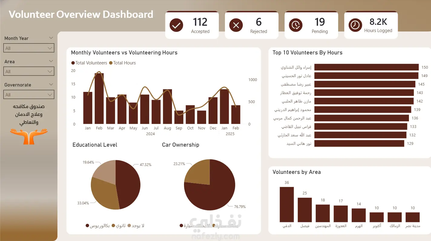 تتضمن اللوحة مجموعة من KPI Cards لعرض المؤشرات الرئيسية، بالإضافة إلى رسوم بيانية توضّح تطور أعداد المتطوعين وساعات التطوع عبر الزمن، وتحليل أفضل المتطوعين حسب عدد الساعات، وتوزيع المتطوعين حسب المنطقة، والمستوى التعليمي، وامتلاك سيارة. كما تم استخدام Slicers لتصفية البيانات حسب الشهر/السنة، المنطقة، والمحافظة، مما يجعل التقرير أكثر مرونة وتفاعلية.