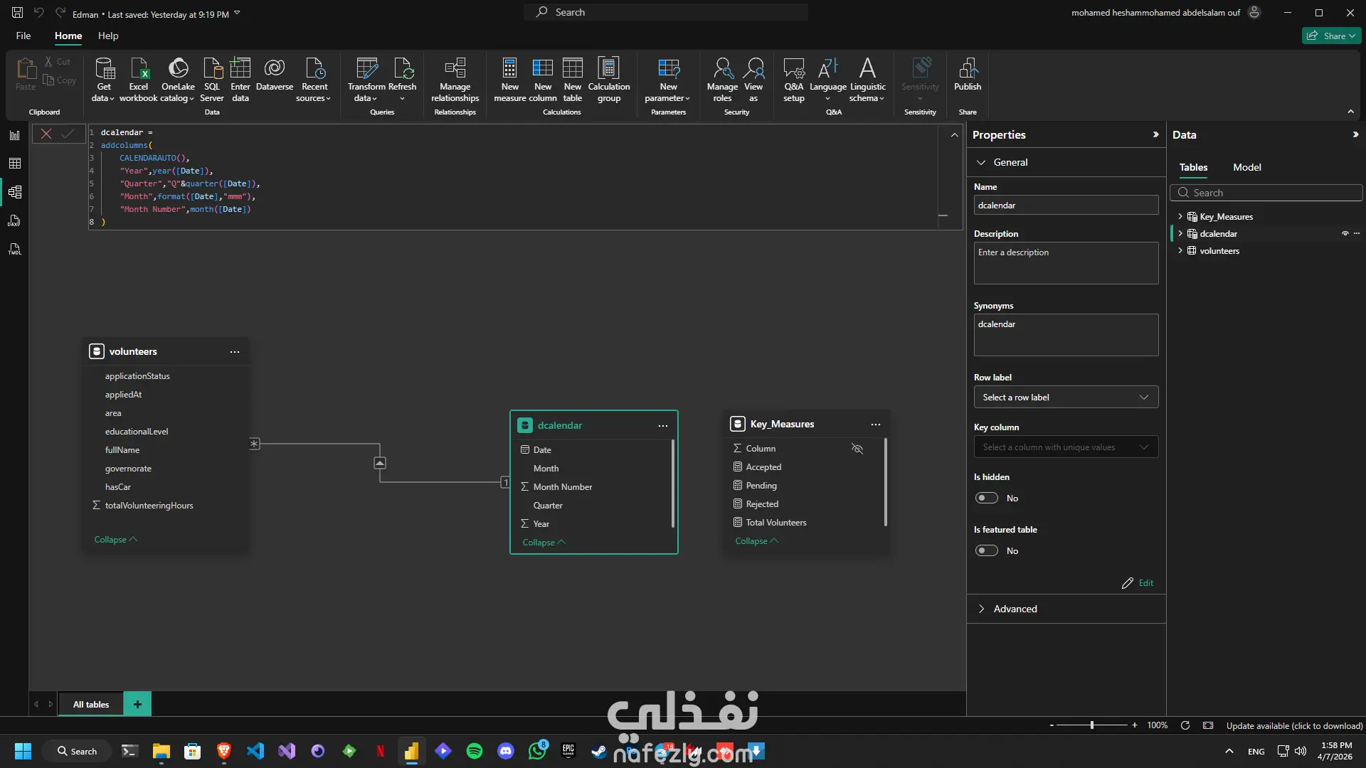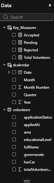 تم كذلك إنشاء جدول Calendar باستخدام DAX لدعم التحليل عبر الزمن من خلال حقول مثل السنة، الربع السنوي، الشهر، ورقم الشهر، إلى جانب تطوير مجموعة من DAX Measures لاحتساب أهم المؤشرات مثل إجمالي المتطوعين، عدد المقبولين، عدد المرفوضين، عدد الطلبات قيد الانتظار، وإجمالي ساعات التطوع.
