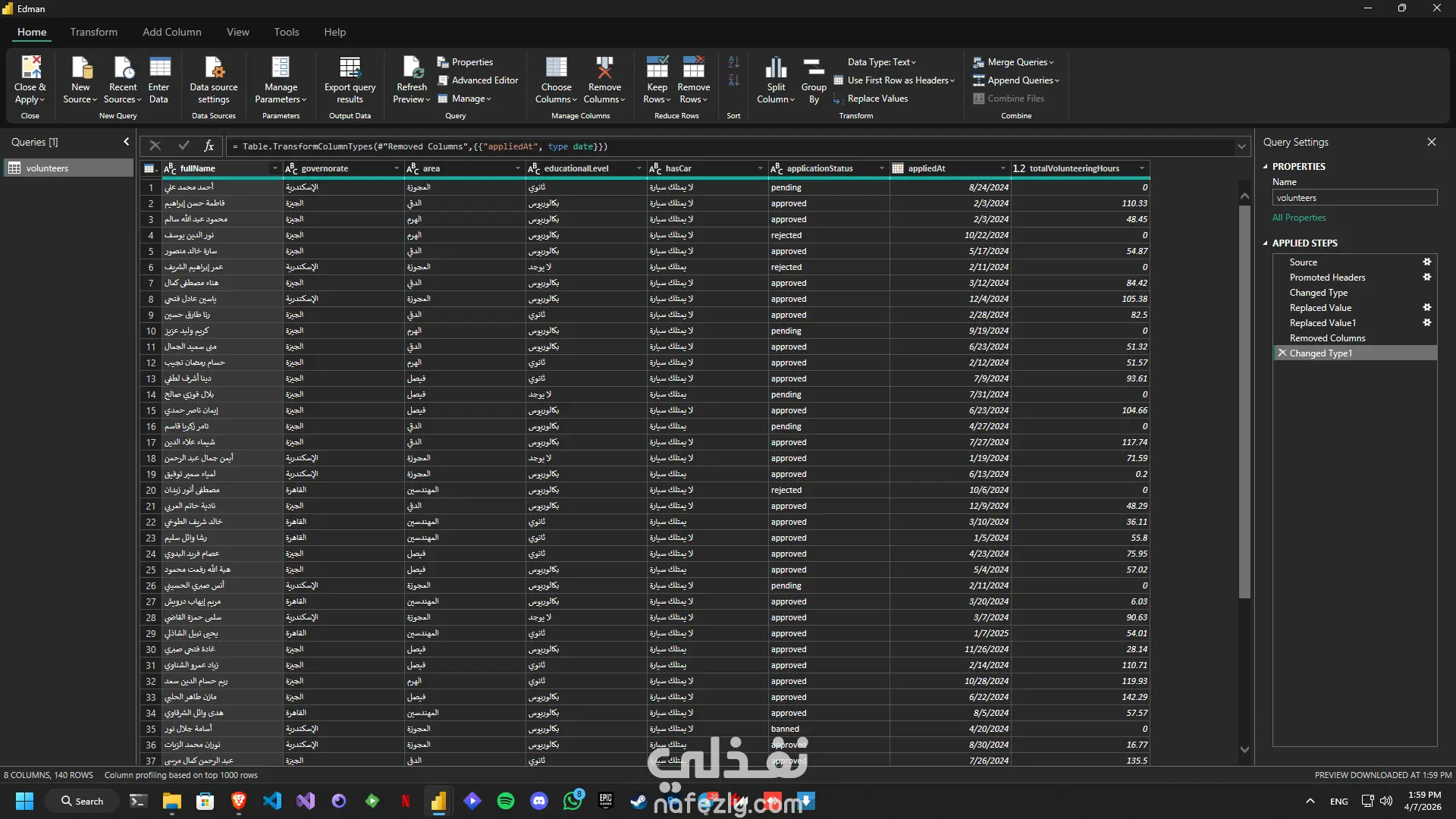 بدأ العمل بمرحلة تنظيف البيانات وتحضيرها باستخدام Power Query، حيث تم ضبط أنواع البيانات، واستبعاد الحقول غير الضرورية، وتحسين شكل البيانات لتصبح أكثر ملاءمة للتحليل داخل التقرير. بعد ذلك تم بناء نموذج بيانات منظم يعتمد على جدول volunteers كجدول رئيسي، مع إنشاء جدول dcalendar للتحليل الزمني، وتجميع المقاييس الأساسية داخل Key_Measures لضمان سهولة الاستخدام وتنظيم عناصر التقرير.