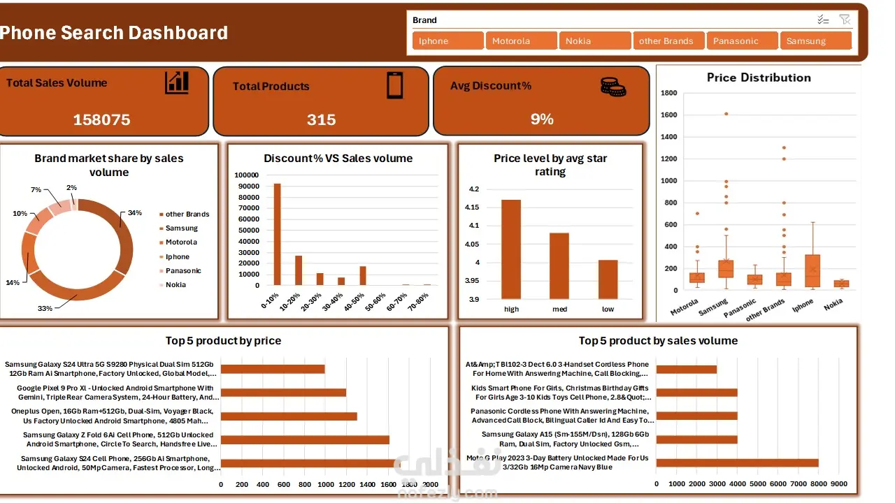 داشبورد تحليل بيانات خاص بسوق الهواتف المحمولة، يهدف إلى فهم سلوك المبيعات، تأثير الخصومات، وتوزيع الأسعار بين العلامات التجارية المختلفة، لدعم قرارات التسعير والتسويق. ? معالجة وتنظيف البيانات (Data Cleaning) تمت عملية تنظيف وتجهيز البيانات باستخدام Power Query، وشملت: إزالة البيانات المكررة (Duplicates) معالجة القيم الفارغة (Null Values) تنسيق التواريخ وتصحيح أنواع البيانات توحيد أسماء العلامات التجارية (Brand Standardization) تجهيز البيانات للتحليل ? نمذجة البيانات (Data Modeling) تم بناء نموذج البيانات باستخدام Power Pivot من خلال: ربط الجداول المختلفة إعداد العلاقات (Relationships) تجهيز النموذج لاستخدام مقاييس DAX ? مؤشرات الأداء الرئيسية (KPIs) تم استخراج مؤشرات الأداء باستخدام DAX، وتشمل: إجمالي حجم المبيعات (Total Sales Volume) متوسط نسبة الخصم (Average Discount %) إجمالي عدد المنتجات – هواتف محمولة (Total Products) ? التحليلات والرسومات البيانية (Charts & Insights) تم تصميم مجموعة من الرسومات التحليلية التي توضح: -الحصة السوقية لكل علامة تجارية بناءً على حجم المبيعات -تحليل العلاقة بين نسبة الخصم وتأثيرها على حجم المبيعات -مقارنة مستويات الأسعار مع متوسط تقييم العملاء -توزيع أسعار الهواتف داخل كل علامة تجارية -أعلى 5 هواتف من حيث السعر -أكثر 5 هواتف تحقيقًا لحجم مبيعات ? الأدوات المستخدمة Power Query Excel Pivot Tables & Charts Power Pivot DAX