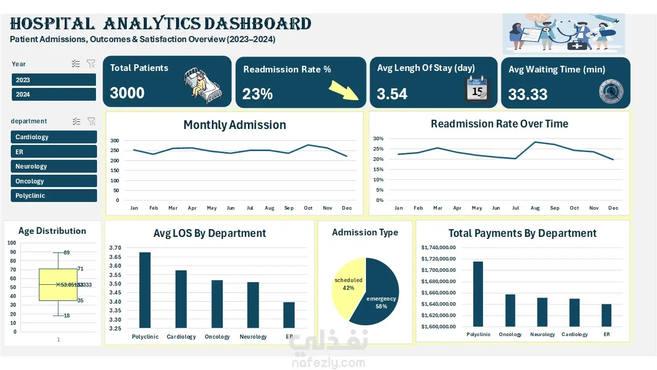 هذا مشروع داشبورد تحليلي للمستشفى باستخدام بيانات افتراضية لعرض مؤشرات الأداء ونتائج المرضى بشكل واضح وتفاعلي. المعروض في الداشبورد: -إجمالي عدد المرضى -معدل إعادة الدخول خلال 30 يوم -متوسط فترة الإقامة -متوسط وقت الانتظار للمرضى -عدد الدخول الشهري للمرضى -تطور معدل إعادة الدخول خلال الفترة الزمنية -توزيع الأعمار بين المرضى -متوسط فترة الإقامة لكل قسم - توزيع نوع الدخول (طارئ / مجدول) -إجمالي المدفوعات من المرضى لكل قسم الأدوات المستخدمة: -Power Query : لتنظيف وتحضير البيانات Excel (Pivot Tables & Charts) : لإنشاء الرسوم البيانية والجداول Power Pivot + DAX : للربط وإنشاء المقاييس والتحليلات التفاعلية ملاحظات: الداشبورد تفاعلي مع Slicers لتحديد السنة و القسم التصميم يركز على سهولة القراءة واستخراج Insights بسرعة