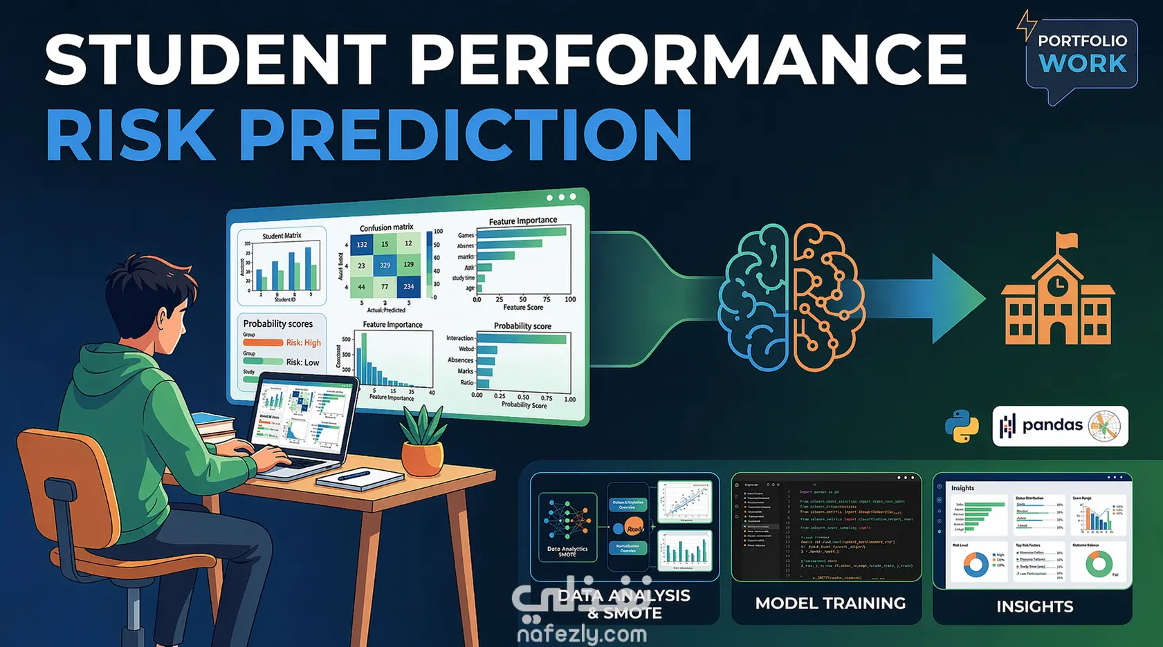 عن المشروع: تطوير نموذج تعلم آلة (ML) يهدف إلى مساعدة المؤسسات التعليمية في التنبؤ المسبق بالطلاب المعرضين لخطر التعثر الدراسي. المشروع لا يكتفي بالتنبؤ فقط، بل يحلل العوامل الأكثر تأثيراً على أداء الطالب لاتخاذ إجراءات وقائية. الخطوات التقنية التي قمت بها: معالجة البيانات (Data Preprocessing): التعامل مع القيم المفقودة وتحويل البيانات النصية إلى رقمية بدقة. هندسة الميزات (Feature Engineering): استخدام تقنيات متقدمة لاختيار الميزات الأكثر ارتباطاً بالنتيجة النهائية لتقليل الأخطاء (Overfitting). موازنة البيانات (Handling Class Imbalance): استخدام تقنية SMOTE لضمان دقة النموذج في التنبؤ بالفئات الأقل تمثيلاً (الطلاب المتعثرين). بناء النماذج: مقارنة عدة خوارزميات (مثل Random Forest و Logistic Regression) للوصول لأفضل دقة ممكنة. النتائج: الوصول إلى نموذج عالي الدقة (High Accuracy) مع التركيز على مقاييس الـ Recall والـ F1-Score لضمان عدم إغفال أي طالب في دائرة الخطر.