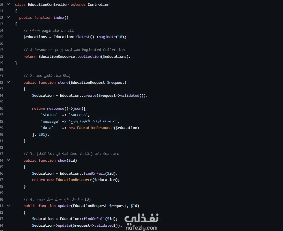 المميزات التقنية: بناء قاعدة البيانات باستخدام Migrations، استخدام Eloquent ORM بفاعلية، وتطبيق الـ Validation Rules.