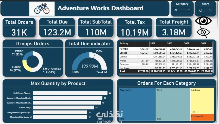 داشبورد تفاعلية متكاملة لبيانات شركة "Adventure Works" مصممة بنمط الألوان الداكنة (Dark Theme) لإبراز البيانات المهمة وتقليل إجهاد العين. تركز اللوحة على تحليل المبيعات وتوزيعها عبر المناطق الجغرافية والفئات المختلفة على مدار عدة سنوات. أبرز الميزات والتحليلات: نظرة مالية شاملة: مقاييس دقيقة لإجمالي العوائد، التكاليف الفرعية، والضرائب عبر بطاقات بيانات واضحة. مصفوفة النمو الزمني (Matrix): جدول تفصيلي يقارن أداء المبيعات في كل منطقة جغرافية على مدار السنوات لتسهيل قراءة التوجهات التاريخية. تحليل المنتجات: تسليط الضوء على المنتجات ذات الكميات المباعة الأعلى (Top Products) لتوجيه جهود التسويق. توزيع الحصص: استخدام المخططات الدائرية Donut Charts) والمساحية لتوضيح النسبة المئوية لمبيعات كل قارة وكل فئة منتجات بوضوح.