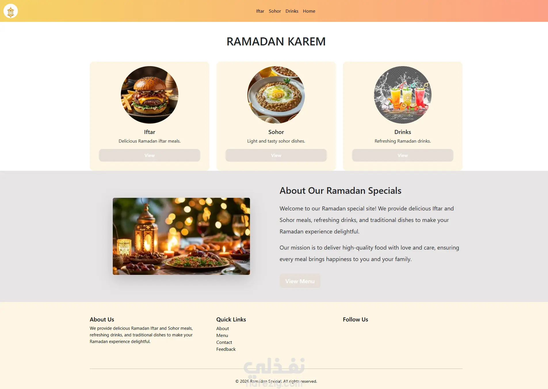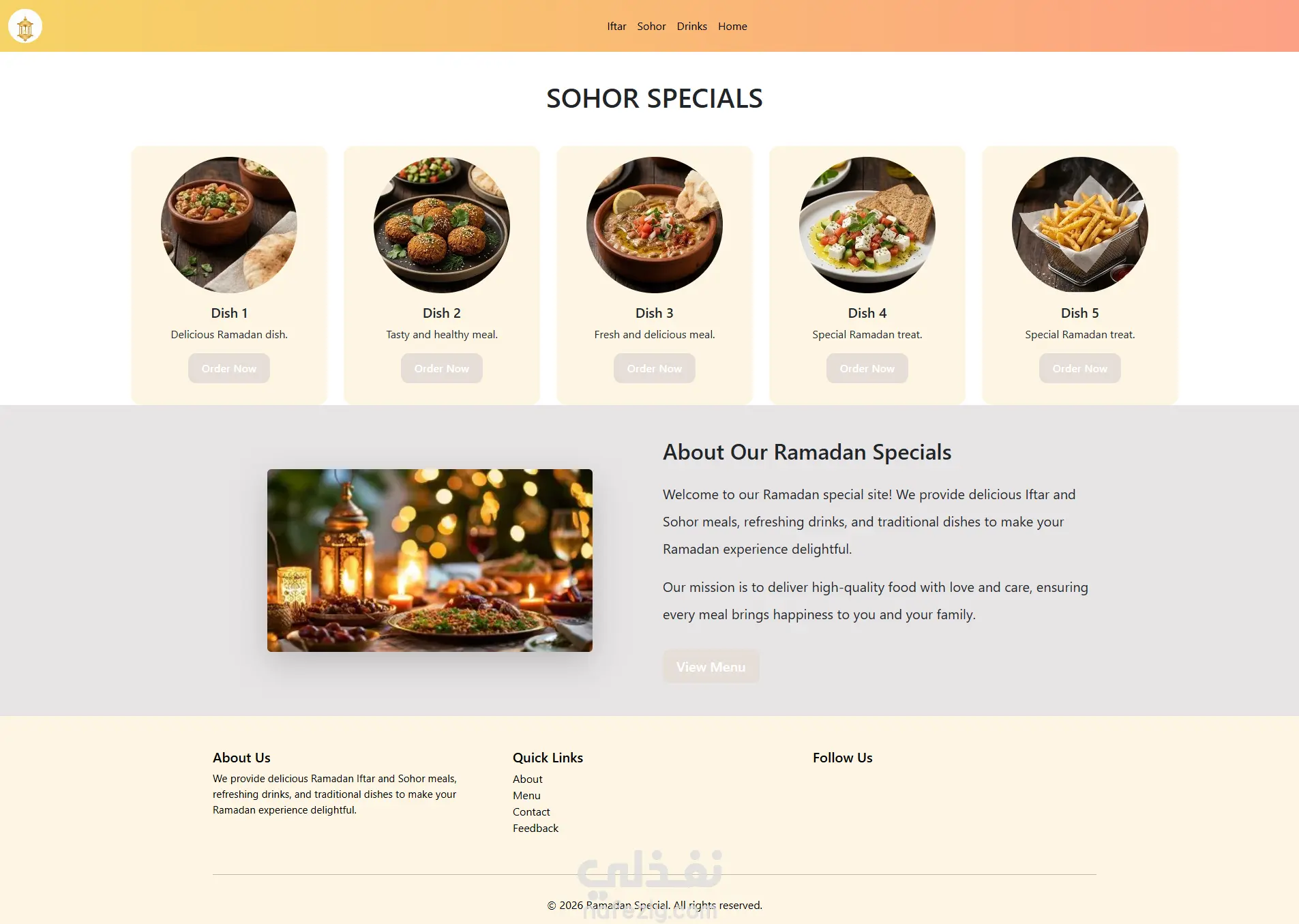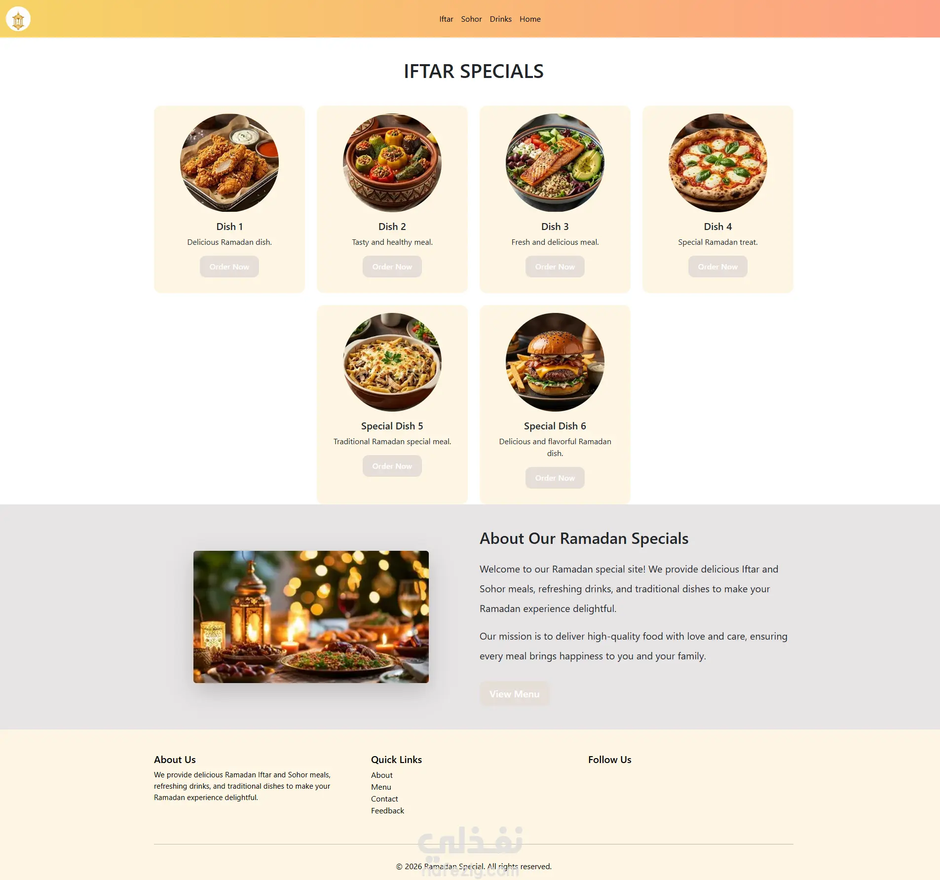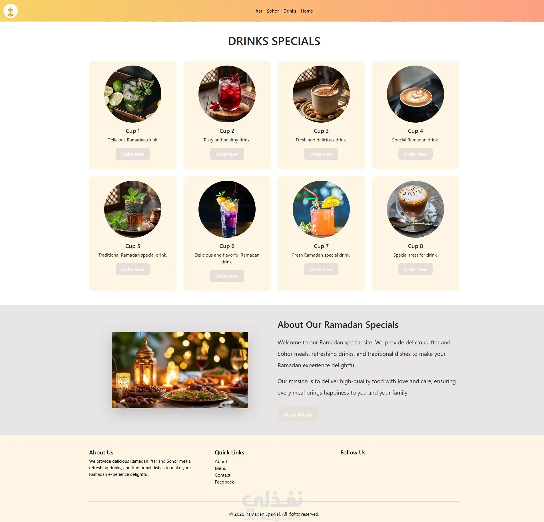 قمت بتصميم وتطوير صفحة ويب تفاعلية خاصة بشهر رمضان، تعرض أقسام الأطعمة والمشروبات بشكل منظم وجذاب.