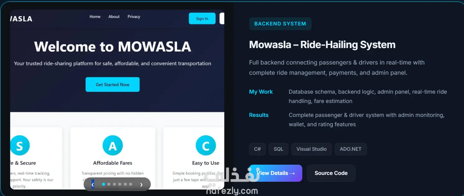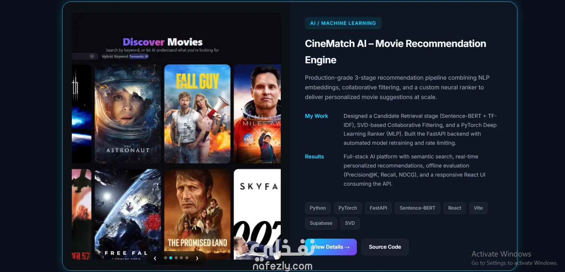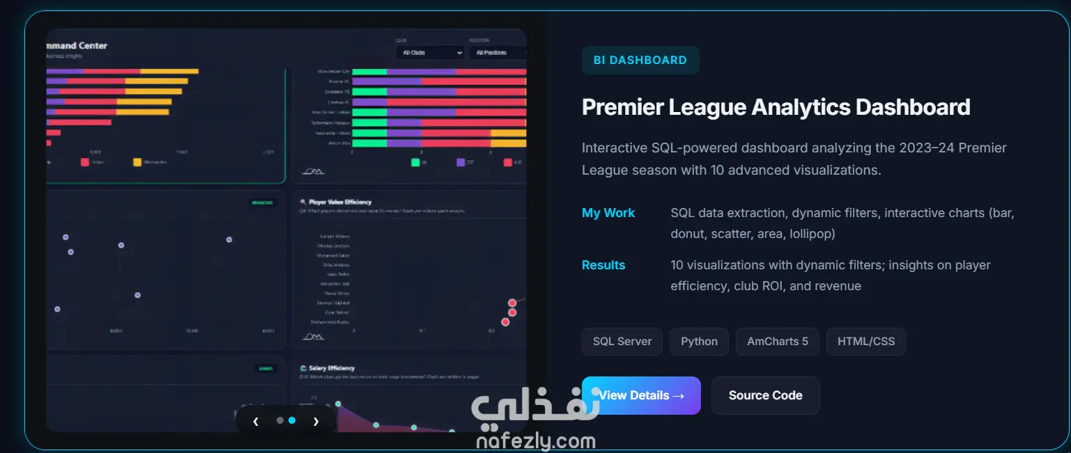 مجموعة مشاريع حقيقية تشمل: نظام توصية أفلام بالذكاء الاصطناعي، نظام نقل متكامل، ولوحة تحليلات تفاعلية للدوري الإنجليزي. كل مشاريعي موجودة في البورتفوليو — تقدر تشوف الشغل بنفسك من الرابط اللي تحت