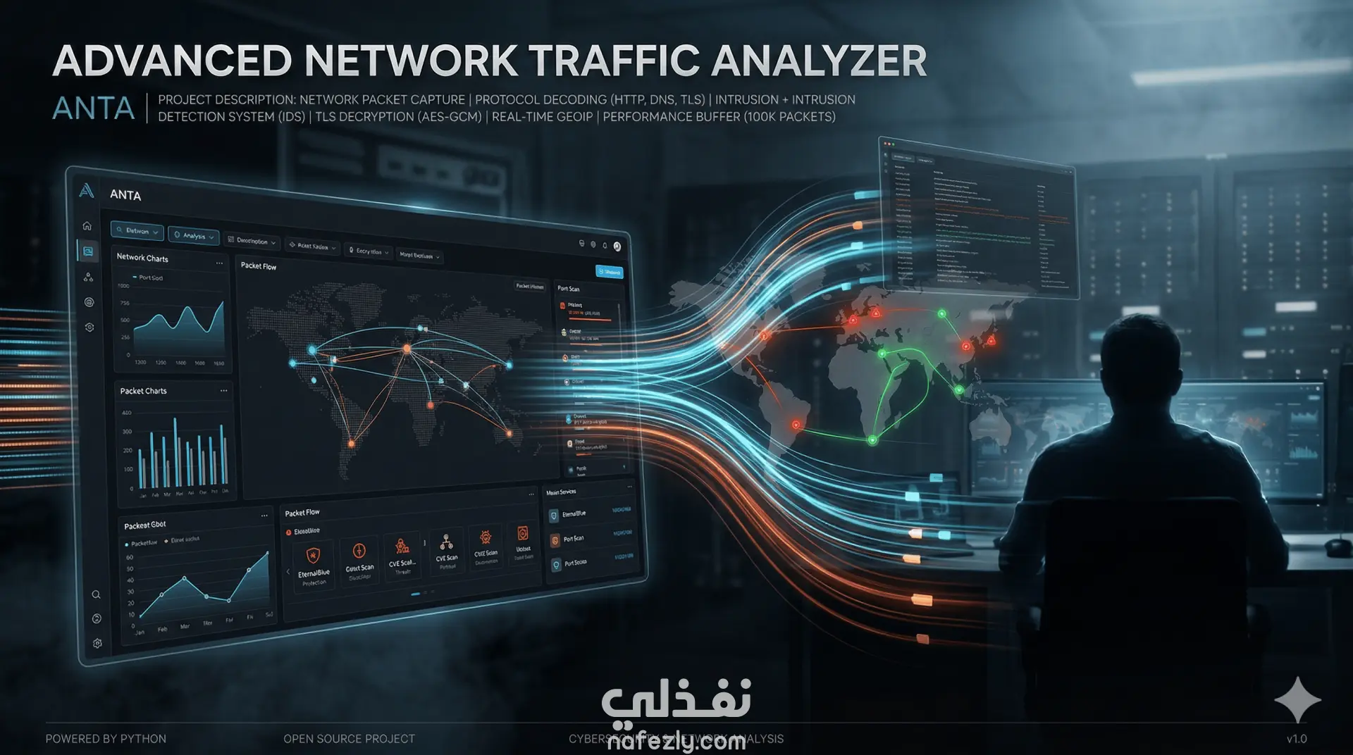 يعد هذا المشروع منصة متكاملة ومفتوحة المصدر لفحص وتحليل حزم بيانات الشبكة، تم بناؤه بالكامل باستخدام لغة بايثون. يجمع النظام بين القدرة الاحترافية على التقاط وتحليل البيانات وبين واجهة رسومية عصرية تعتمد على النمط الداكن، مما يجعله أداة مثالية لمهندسي الشبكات، خبراء الأمن السيبراني، والمحققين الجنائيين. المميزات التقنية الأساسية: 1. التقاط وتحليل الحزم (Packet Capture & Decoding): * دعم الالتقاط المباشر للبيانات من واجهات الشبكة المختلفة (Wired/Wireless) أو إعادة تشغيل ملفات PCAP المسجلة. * فك تشفير كامل لـ 12 بروتوكولاً مختلفاً تشمل: Ethernet, ARP, IPv4/6, TCP, UDP, ICMP, DNS, HTTP/1.x, HTTP/2, TLS, و QUIC. * واجهة رسومية تعرض تفاصيل البروتوكولات في شجرة قابلة للتوسيع مع عرض البيانات بنظام Hex و ASCII. 2. نظام كشف التسلل الذكي (IDS): * محرك تحليل فوري يعتمد على سمات الحزم (Attributes) بدلاً من النصوص لضمان السرعة والدقة. * كشف تلقائي لهجمات SYN Flood، وفحص المنافذ (Port Scan)، وهجمات DNS Amplification. * قاعدة بيانات مدمجة لثغرات CVE تغطي أكثر من 20 خدمة معرضة للخطر مثل EternalBlue و BlueKeep. 3. فك تشفير بروتوكول TLS: * القدرة على فك تشفير حركة مرور HTTPS في الوقت الفعلي باستخدام ملفات SSLKEYLOGFILE. * دعم خوارزميات التشفير الحديثة مثل AES-GCM لبروتوكولي TLS 1.2 و TLS 1.3. 4. الذكاء الجغرافي والإحصائيات: * تحديد الموقع الجغرافي لعناوين IP (GeoIP) وعرض أكواد الدول مباشرة في جدول الحزم. * لوحة تحكم إحصائية تفاعلية تشمل رسوماً بيانية لتوزيع البروتوكولات، معدل نقل البيانات، وأكثر الأجهزة استهلاكاً للشبكة. 5. إدارة الأداء والذاكرة: * استخدام بنية المخزن المؤقت الدائري (Circular Buffer) بسعة 100,000 حزمة لمنع استهلاك الذاكرة العشوائية. * نظام تحديث للواجهة الرسومية يعمل بآلية الدفعات كل 100 مللي ثانية للحفاظ على سلاسة الأداء حتى عند معدلات الزحام العالية (10,000 حزمة/ثانية). 6. أدوات التحليل المتقدمة: * ميزة "تتبع المسار" (Follow Stream) لإعادة بناء محادثات TCP و HTTP بالكامل. * إمكانية تصدير البيانات الخام (Raw Payloads) لاستخراج الملفات والبرمجيات من داخل الترافيك. * نظام فلترة متطور يعتمد على لغة BPF في مستوى النواة (Kernel) أو الفلاتر البرمجية المخصصة داخل التطبيق. التقنيات المستخدمة في التطوير: * اللغة البرمجية: Python 3.11. * معالجة الشبكات: Scapy 2.5. * الواجهة الرسومية: PyQt6 6.6. * الرسوم البيانية: Matplotlib 3.8. * التشفير: cryptography 41.
