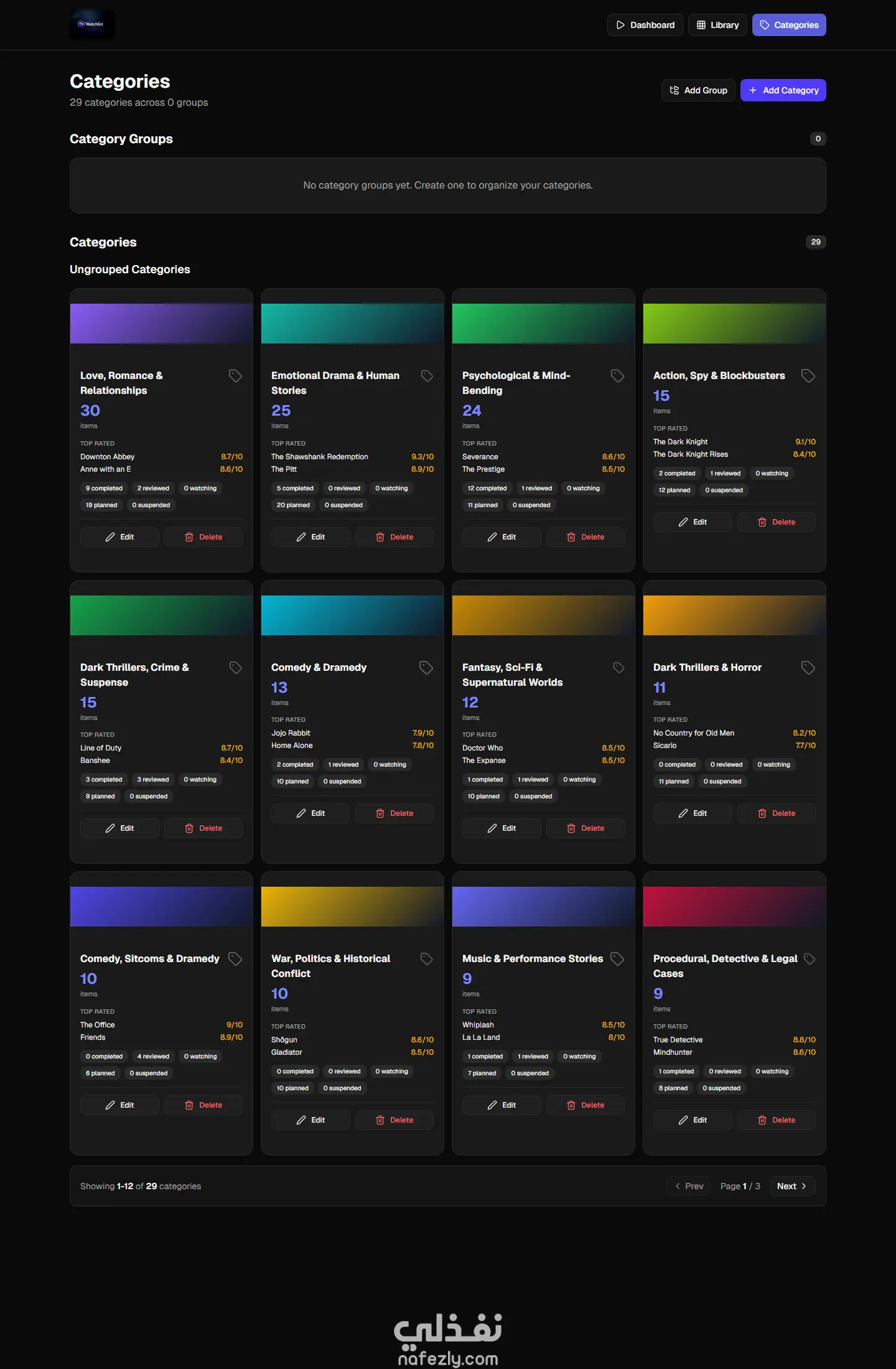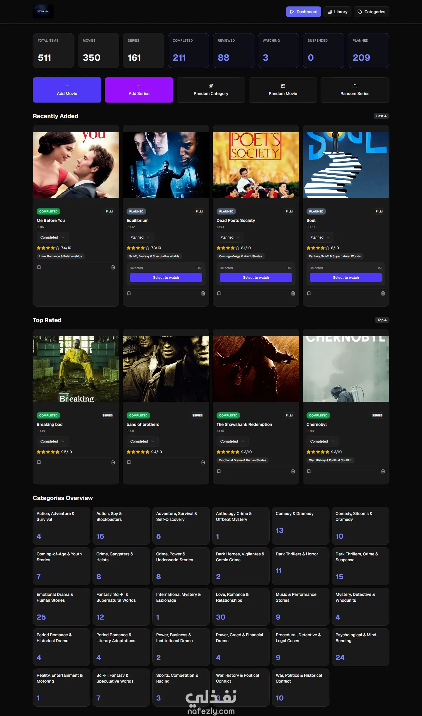 قمت بتطوير تطبيق ويب متكامل لإدارة ومتابعة الأفلام والمسلسلات، يتيح للمستخدم تنظيم المحتوى الخاص به في مكان واحد مع إمكانية التقييم والتصنيف واختيار ما يشاهده لاحقًا بسهولة. التطبيق يوفر تجربة استخدام سلسة من خلال لوحة تحكم حديثة تعرض إحصائيات مباشرة، وآخر الإضافات، وأعلى التقييمات، مع نظام إدارة متكامل للمحتوى. أهم المميزات: - لوحة تحكم تعرض إحصائيات مباشرة وآخر العناصر المضافة - مكتبة متكاملة للأفلام والمسلسلات (بحث – فلترة – ترتيب – Pagination) - إمكانية العرض بنمط Grid أو List - نظام تصنيفات ومجموعات لتنظيم المحتوى - حالات متابعة متعددة (Planned – Watching – Completed – Reviewed – Suspended) - إمكانية تقييم المحتوى - اختيار عشوائي لما يمكن مشاهدته (Random Picker) - عمليات CRUD كاملة لإدارة المحتوى والتصنيفات - واجهة حديثة متجاوبة (Dark Mode) تعمل على جميع الأجهزة