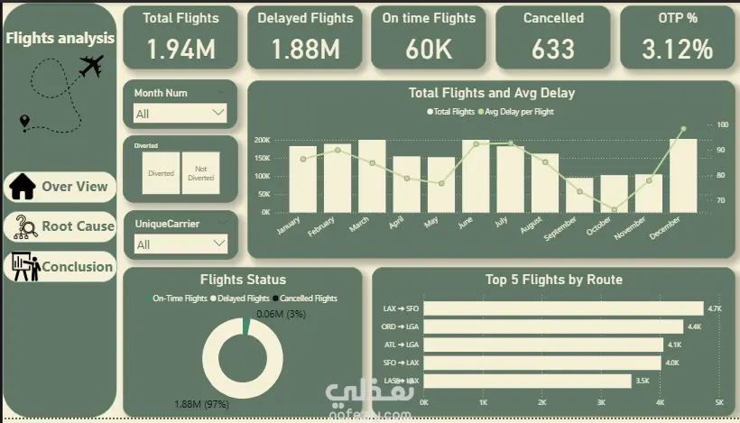 تقرير تحليلي تفاعلي متكامل يتكون من ثلاث صفحات مصممة باحترافية لتشخيص أداء قطاع الطيران. يهدف المشروع إلى تتبع ملايين الرحلات الجوية، قياس معدلات الانضباط (On-Time Performance)، وإجراء تحليل عميق للأسباب الجذرية (Root Cause Analysis) لتأخير أو إلغاء الرحلات، مما يساعد شركات الطيران وإدارات المطارات على اتخاذ قرارات تشغيلية لتقليل الخسائر وتحسين تجربة المسافرين.