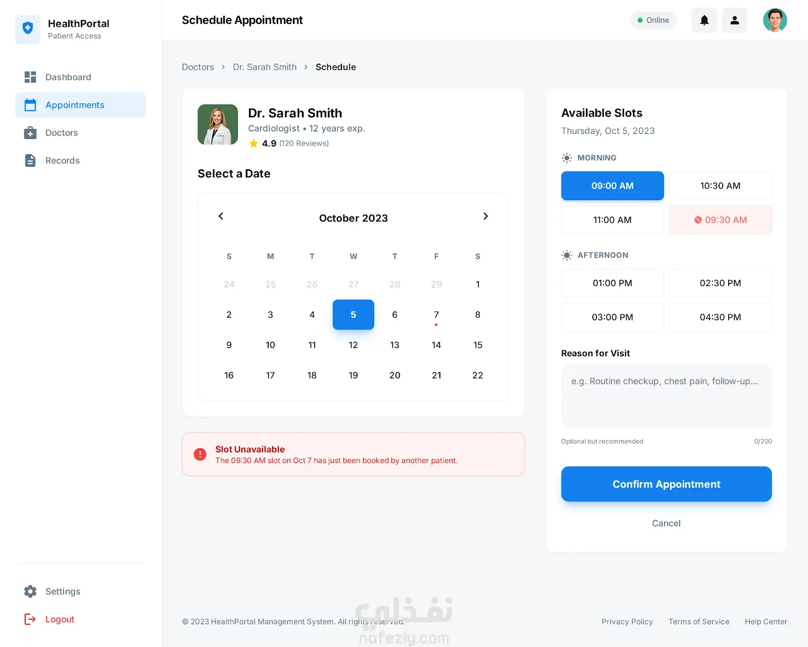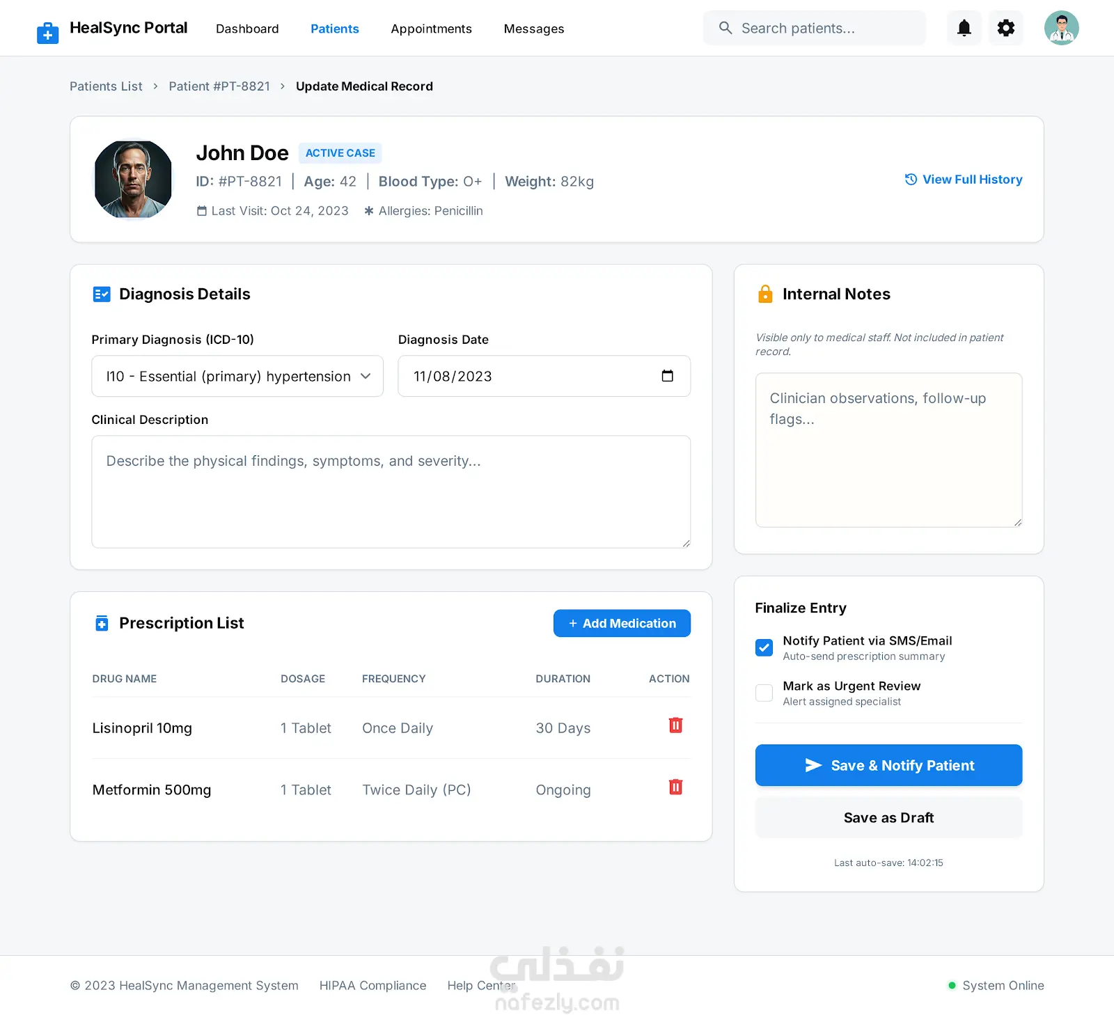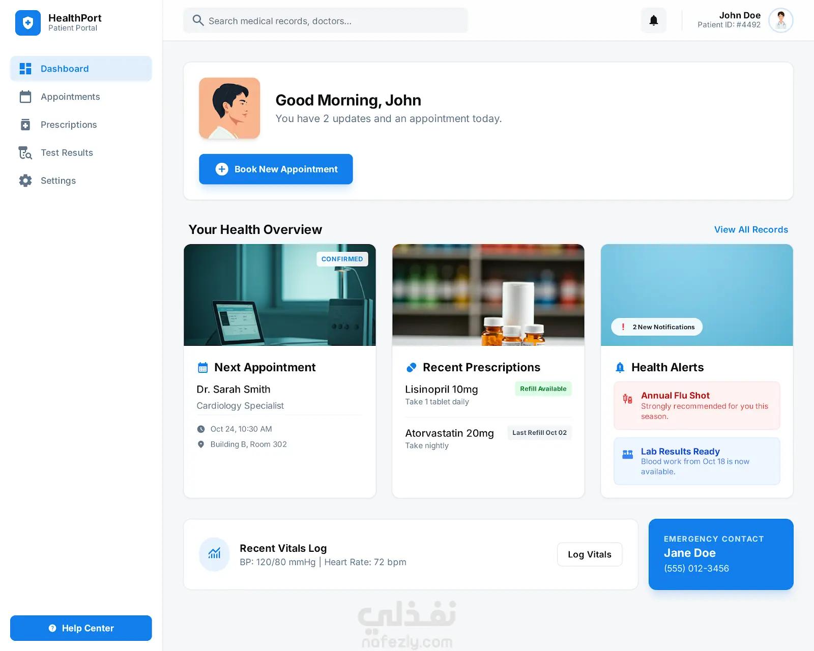 نظام صحي إلكتروني (Online Health System) شامل يهدف إلى إدارة البيانات الطبية والمواعيد بين المرضى والأطباء والإدارة بطريقة سهلة وآمنة. تم التركيز في المشروع على بناء واجهات استخدام احترافية باستخدام HTML وCSS وBootstrap وJavaScript مع مراعاة سهولة الاستخدام، أمان البيانات، وتنظيم العمليات داخل النظام. يتضمّن النظام تسجيل المستخدمين بأدوار مختلفة (مريض – طبيب – مدير)، تسجيل الدخول والخروج، صلاحيات وصول حسب الدور (RBAC)، وحماية كلمات المرور من خلال التحقق من قوة كلمة السر. كما يحتوي النظام على لوحات تحكم مخصّصة لكل دور: لوحة المريض: حجز المواعيد، متابعة حالة الموعد، عرض التاريخ الطبي، وإدارة الملف الشخصي. لوحة الطبيب: إدارة المرضى، قبول أو رفض المواعيد، وإضافة السجلات الطبية مع تتبع التحديثات والنسخ. لوحة المدير (Admin): إدارة المستخدمين (CRUD)، الموافقة على الأطباء، مراقبة سجلات التحديث، عرض التحليلات والإحصائيات، والبحث والفرز والفلاتر. كما يشمل المشروع ميزات متقدمة مثل منع الحجز المزدوج، تتبع سجلات المرضى، تحميل الوصفات الطبية بصيغة PDF، إلغاء وحذف الحساب بعد مدة، تسجيل سجل التحديثات للأدمن، وعرض بيانات تحليلية عن النظام. يقدّم النظام تجربة مثالية من خلال واجهات متجاوبة، سهولة في التنقل، Scroll Animations، وتنظيم دقيق للصفحات بما يخدم كل دور داخل المنظومة الصحية الإلكترونية.