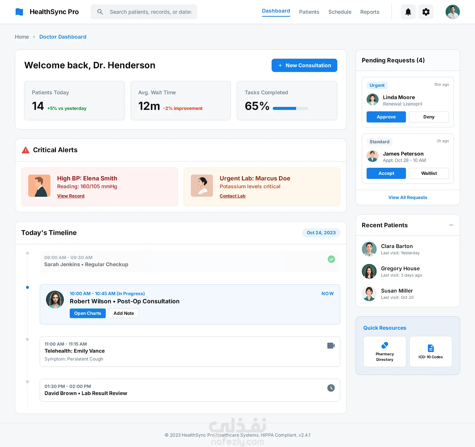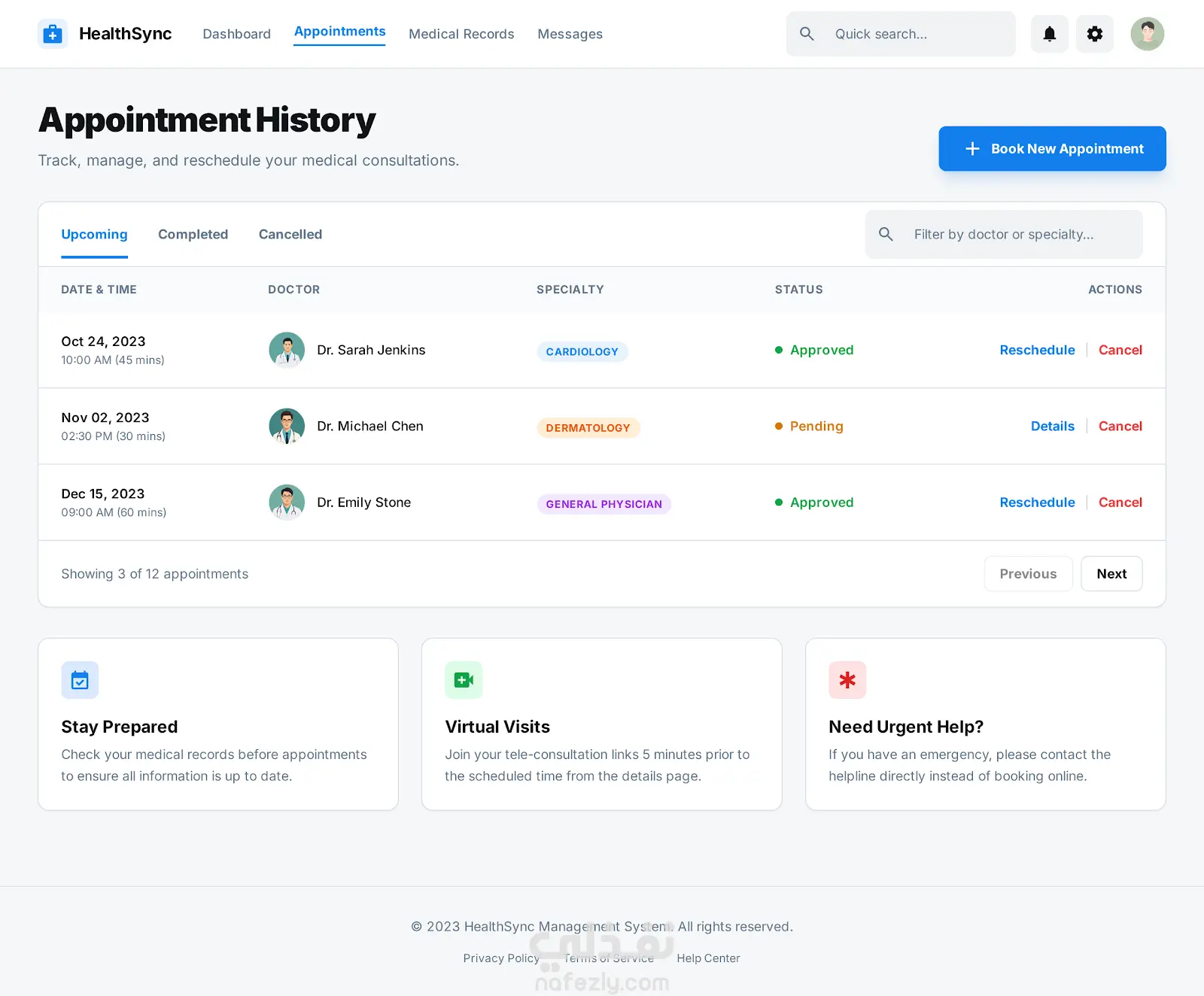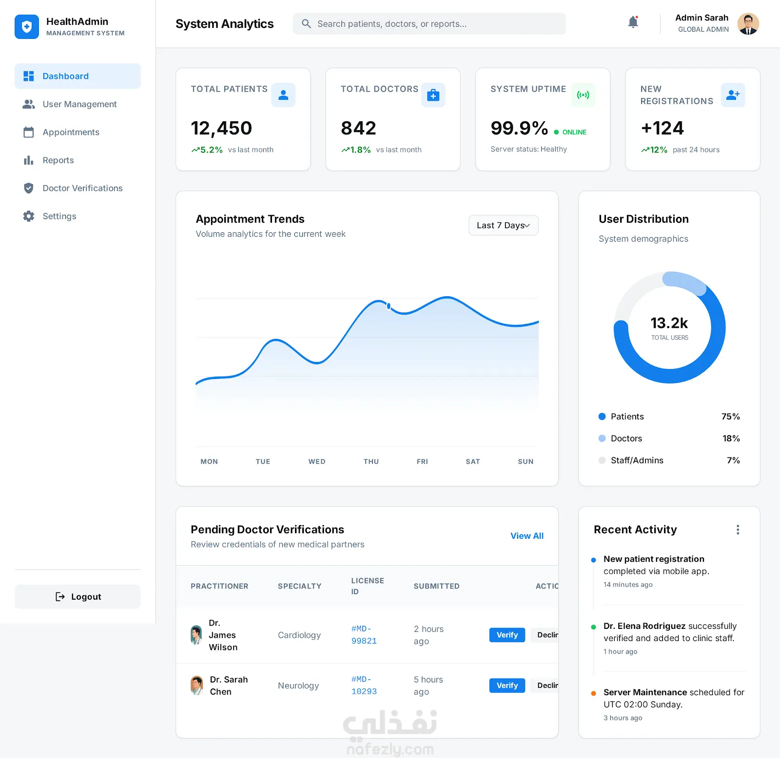 نظام صحي إلكتروني (Online Health System) شامل يهدف إلى إدارة البيانات الطبية والمواعيد بين المرضى والأطباء والإدارة بطريقة سهلة وآمنة. تم التركيز في المشروع على بناء واجهات استخدام احترافية باستخدام HTML وCSS وBootstrap وJavaScript مع مراعاة سهولة الاستخدام، أمان البيانات، وتنظيم العمليات داخل النظام. يتضمّن النظام تسجيل المستخدمين بأدوار مختلفة (مريض – طبيب – مدير)، تسجيل الدخول والخروج، صلاحيات وصول حسب الدور (RBAC)، وحماية كلمات المرور من خلال التحقق من قوة كلمة السر. كما يحتوي النظام على لوحات تحكم مخصّصة لكل دور: لوحة المريض: حجز المواعيد، متابعة حالة الموعد، عرض التاريخ الطبي، وإدارة الملف الشخصي. لوحة الطبيب: إدارة المرضى، قبول أو رفض المواعيد، وإضافة السجلات الطبية مع تتبع التحديثات والنسخ. لوحة المدير (Admin): إدارة المستخدمين (CRUD)، الموافقة على الأطباء، مراقبة سجلات التحديث، عرض التحليلات والإحصائيات، والبحث والفرز والفلاتر. كما يشمل المشروع ميزات متقدمة مثل منع الحجز المزدوج، تتبع سجلات المرضى، تحميل الوصفات الطبية بصيغة PDF، إلغاء وحذف الحساب بعد مدة، تسجيل سجل التحديثات للأدمن، وعرض بيانات تحليلية عن النظام. يقدّم النظام تجربة مثالية من خلال واجهات متجاوبة، سهولة في التنقل، Scroll Animations، وتنظيم دقيق للصفحات بما يخدم كل دور داخل المنظومة الصحية الإلكترونية.
