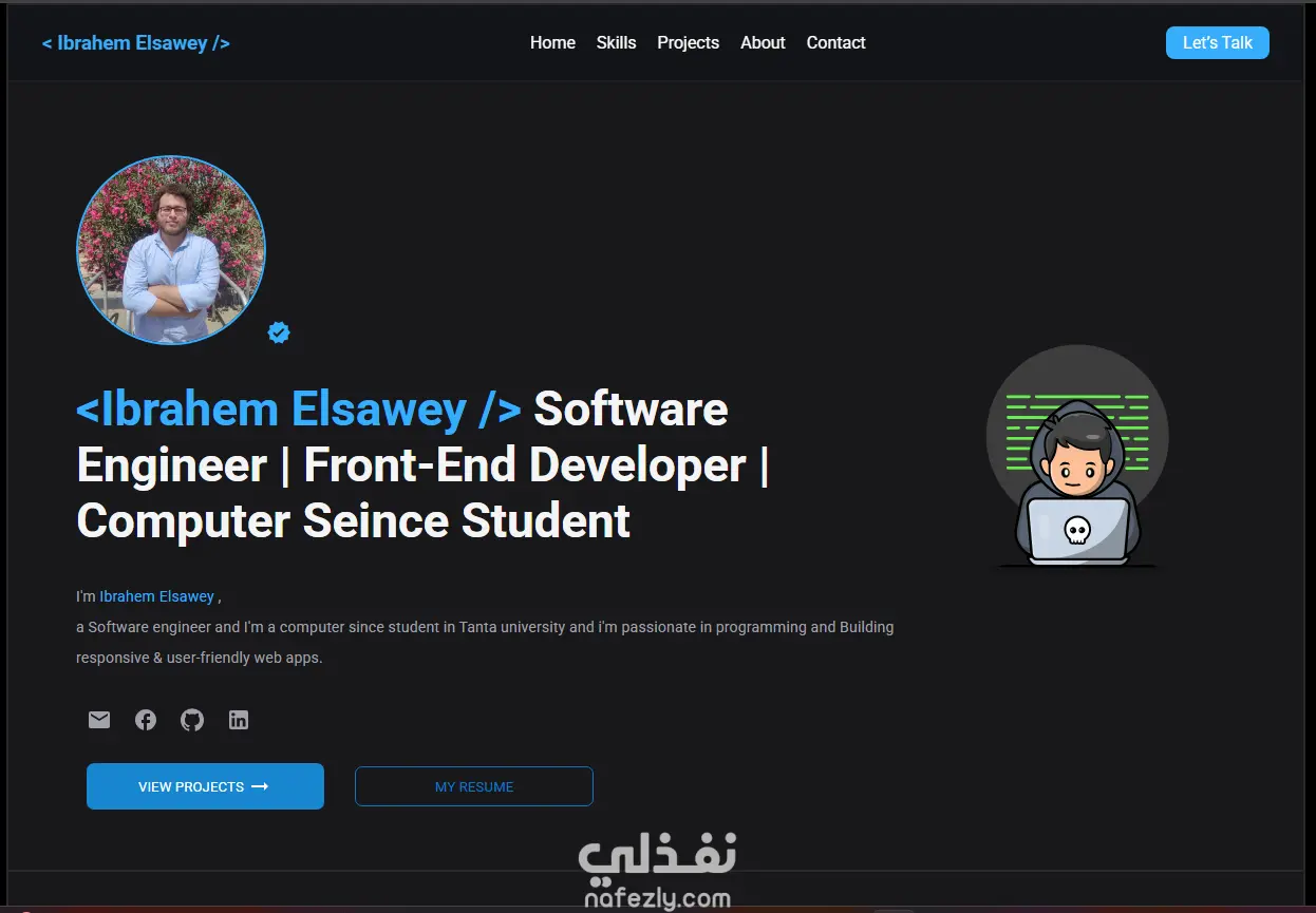 قمت بتطوير موقع شخصي تفاعلي باستخدام React، يهدف إلى عرض نبذة عني ومهاراتي وخدماتي في مجال تطوير الويب بشكل احترافي. الموقع يتميز بتصميم عصري ومتجاوب يعمل بسلاسة على جميع الأجهزة (كمبيوتر – موبايل – تابلت)، مع تجربة مستخدم بسيطة وسريعة. يتضمن الموقع أقسام أساسية مثل: النبذة التعريفية (About): تقديم معلومات شخصية ومهنية مختصرة. المهارات (Skills): عرض تقنيات وخبرات العمل بشكل منظم وجذاب. الأعمال (Portfolio): إبراز المشاريع السابقة بطريقة تفاعلية. التواصل (Contact): نموذج مراسلة بسيط يتيح للزوار التواصل بسهولة. ركزت في هذا المشروع على: استخدام React Components لسهولة إدارة وتحديث المحتوى. اعتماد تصميم متجاوب (Responsive Design) باستخدام CSS وFlexbox/Grid. تحسين الأداء والسرعة لضمان تجربة مستخدم مثالية.
