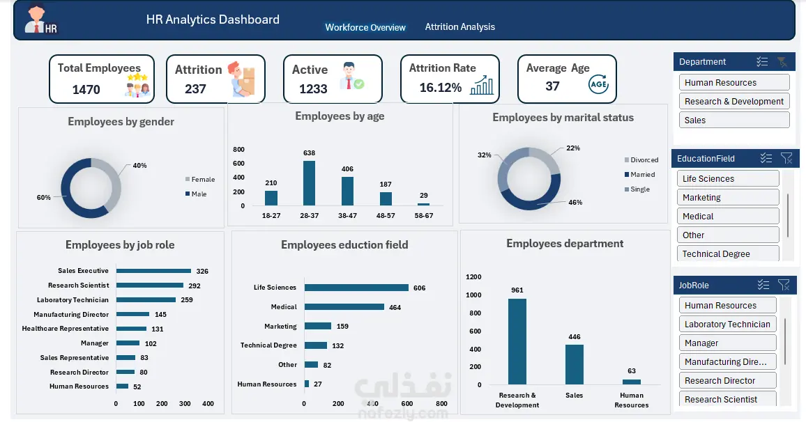 لوحة مؤشرات تفاعلية لتحليل بيانات الموارد البشرية (HR Analytics Dashboard)