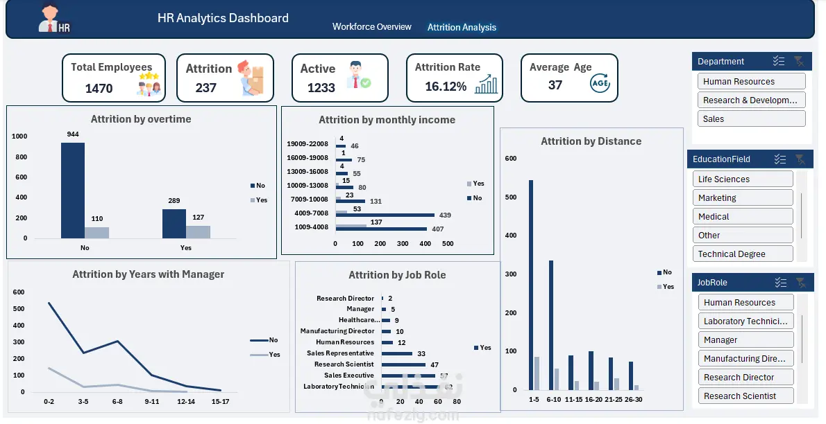 مشروع تحليل بيانات شامل لقطاع الموارد البشرية (HR Analytics)، يهدف إلى دراسة ظاهرة استقالات الموظفين (Attrition) داخل الشركة، وتحويل البيانات الخام إلى رؤى وقرارات استراتيجية تساهم في تقليل معدل دوران العمالة وتوفير تكاليف التوظيف. جمالي القوى العاملة (Total Employees): 1,470 موظف. معدل الاستقالة (Attrition Rate): 16.12%. عدد الحالات المغادرة (Attrition Count): 237 حالة. الموظفين على رأس العمل (Active Employees): 1,233 موظف. متوسط أعمار الموظفين (Average Age): 37 عاماً. أهم التحليلات والنتائج (Insights): الفئات المالية: تحديد فئة الرواتب الأكثر عرضة للاستقالة ($1k$- 4k) وتقديم توصيات بشأنها. علاقة الإدارة: اكتشاف أن 61.6% من الاستقالات تحدث في أول سنتين للموظف تحت إدارة معينة. توازن الحياة والعمل: تحليل تأثير الساعات الإضافية (Overtime) كعامل أساسي في ترك العمل. المؤشرات الجغرافية: دراسة مدى تأثير بُعد السكن عن مقر العمل على استقرار الموظف. المميزات التقنية للوحة المؤشرات (Dashboard): التفاعلية (Interactivity): لوحة تحكم مرنة تتيح تصفية البيانات (Slicers) بناءً على القسم، التعليم، والمسمى الوظيفي.. سهولة التصفح: تصميم ثنائي الصفحات (نظرة عامة على القوى العاملة + تحليل تفصيلي للاستقالات). تجربة المستخدم: استخدام تنسيقات لونية ثابتة ومريحة للعين لتسهيل قراءة الأرقام والـ KPIs. الأدوات المستخدمة: Microsoft Excel: لمعالجة البيانات وتصميم الواجهة. Power Query: لتنظيف وتحويل البيانات الخام. Data Visualization: لتحويل الأرقام إلى رسوم بيانية تفاعلية سهلة الفهم.