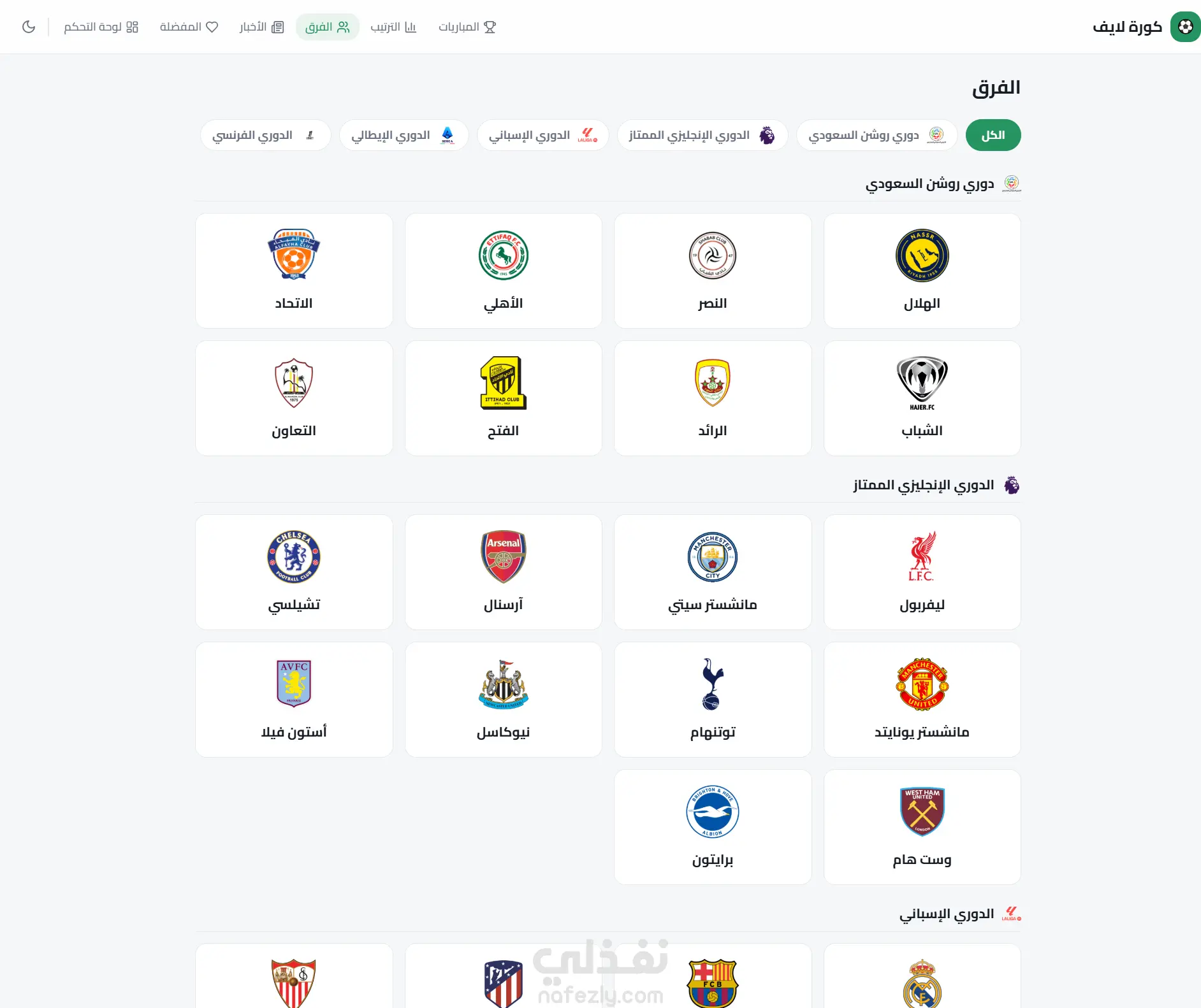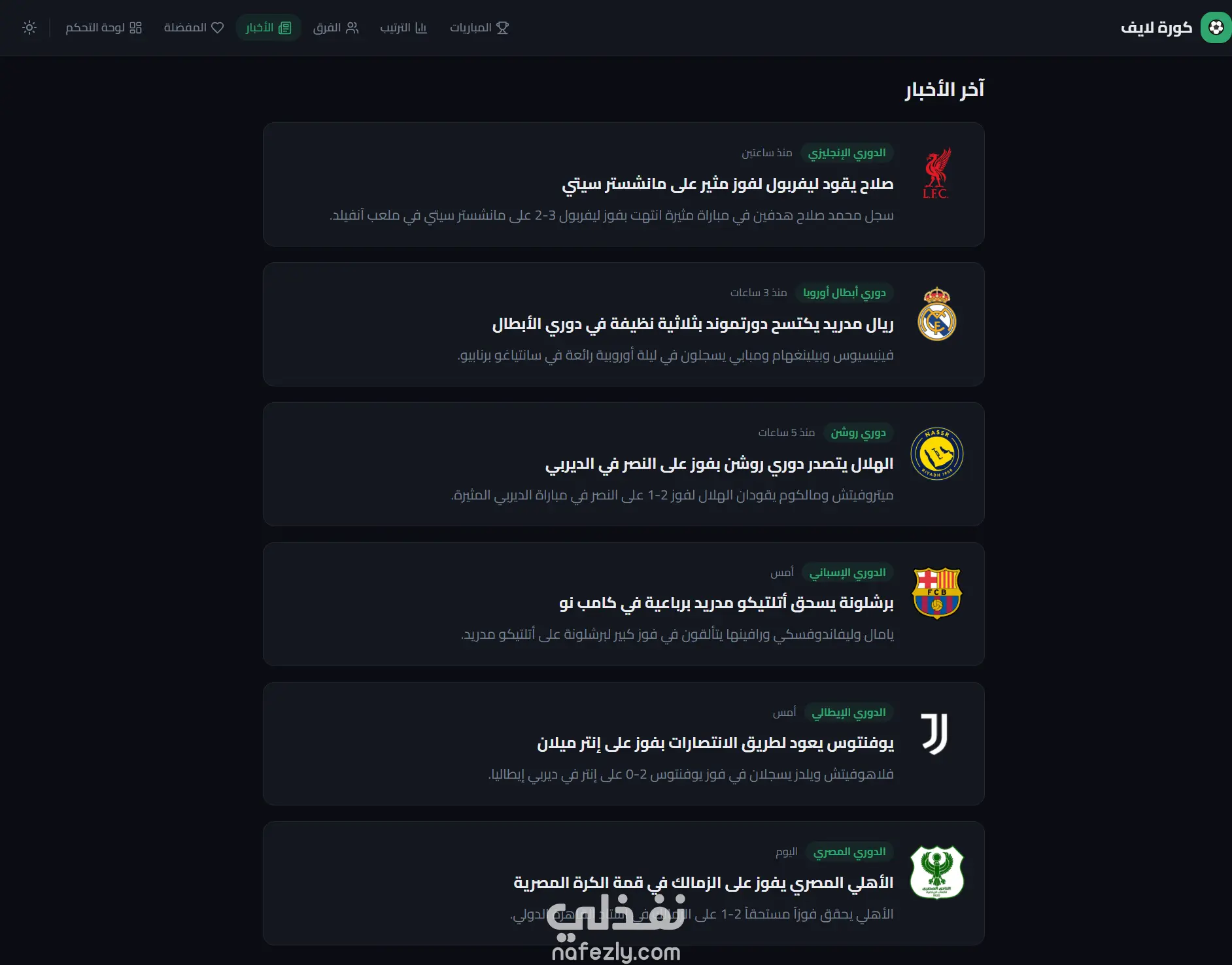 تطوير منصة "كورة لايف" - تطبيق ويب متكامل لمتابعة نتائج مباريات كرة القدم مباشرة