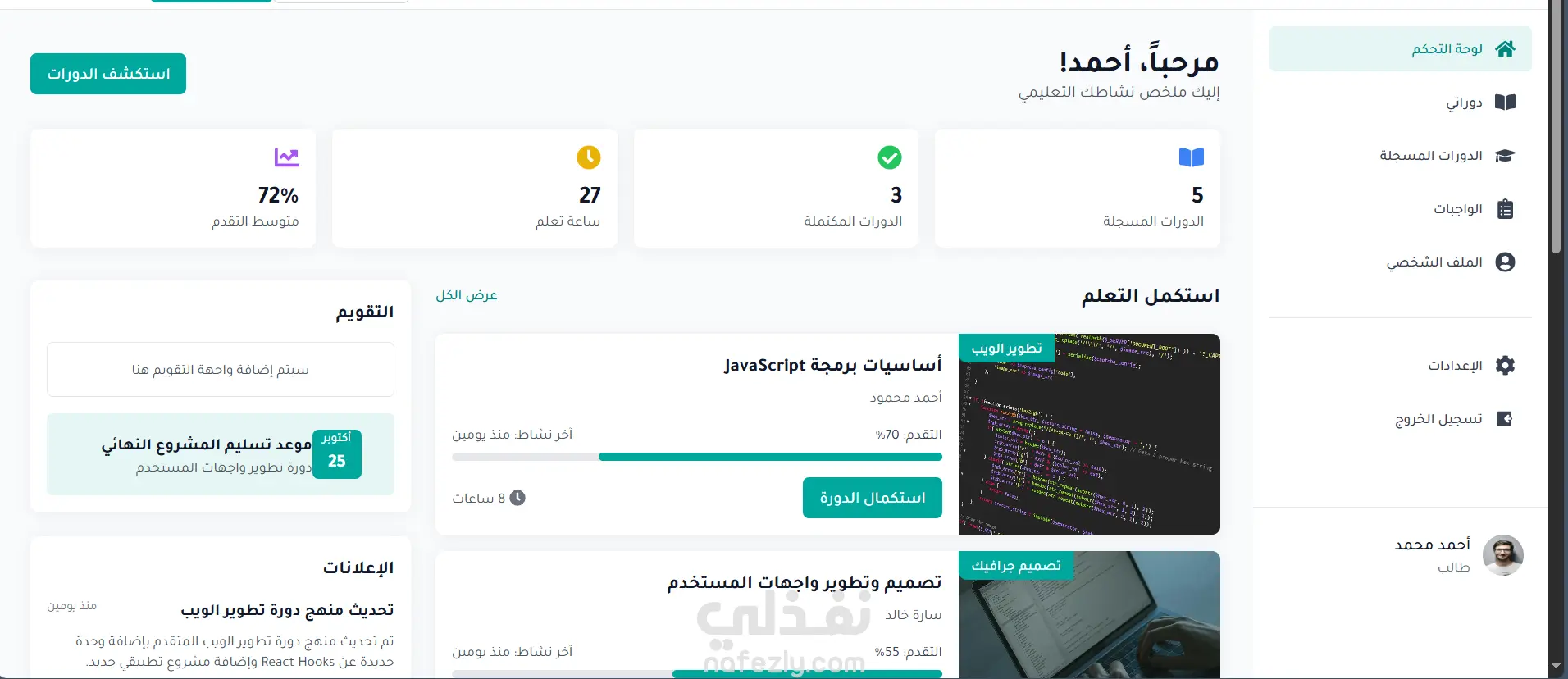 تعلّم هو نظام إدارة تعلم (LMS) متكامل يُمكِّن المؤسسات التعليمية، والمدربين، والطلاب من تجربة تعليمية حديثة وسلسة عبر الإنترنت. يوفّر الموقع بيئة تفاعلية تدعم إنشاء الدورات، متابعة تقدم الطلاب، وإدارة المحتوى التعليمي بكفاءة عالية. مميزات تعلّم: لوحة تحكم مخصصة للطلاب والمعلمين والإداريين. إمكانية إنشاء دورات تعليمية تحتوي على فيديوهات، ملفات PDF، اختبارات، وواجبات. نظام تتبّع لتقدُّم الطلاب وتقارير تفصيلية عن الأداء. منتديات تفاعلية وغرف دردشة للنقاش بين الطلاب والمعلمين. نظام تقييم وشهادات إلكترونية عند إتمام الدورات. تنظيم الجداول الزمنية وإرسال إشعارات بالمهام القادمة. تعلّم هو الحل الأمثل للمؤسسات الأكاديمية، المراكز التدريبية، أو الشركات التي تبحث عن وسيلة فعّالة لتقديم التعليم والتدريب عن بُعد بطريقة احترافية وسهلة الاستخدام.