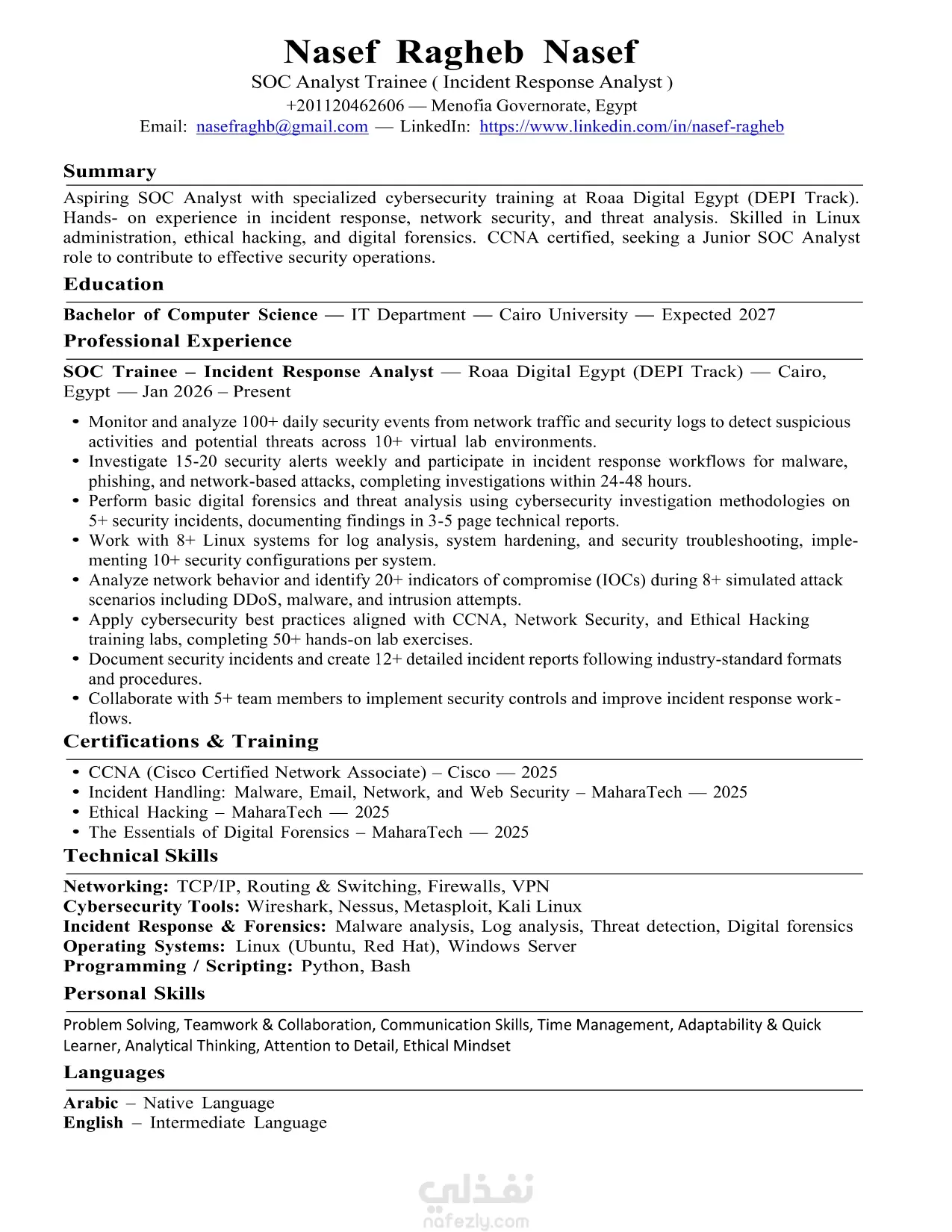 أقوم بتصميم سيرة ذاتية احترافية (CV) بشكل عصري ومنظم يساعد على زيادة فرص القبول في الوظائف. يتم تصميم الـ CV بطريقة احترافية متوافقة مع أنظمة التوظيف (ATS Friendly) مع التركيز على إبراز المهارات والخبرات بشكل واضح. ما تحصل عليه: تصميم CV احترافي وحديث تنسيق منظم وسهل القراءة إمكانية التعديل حسب الطلب تسليم سريع بجودة عالية مناسب للطلاب والخريجين والباحثين عن عمل في جميع المجالات.