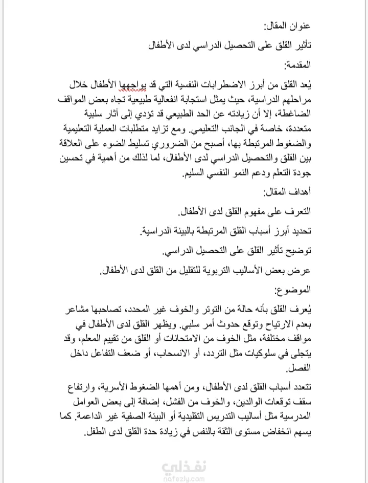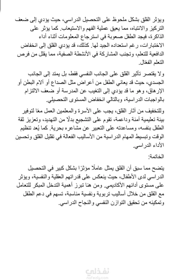 كتابة مقال عن تأثير القلق علي التحصيل الدراسي لدي الاطفال