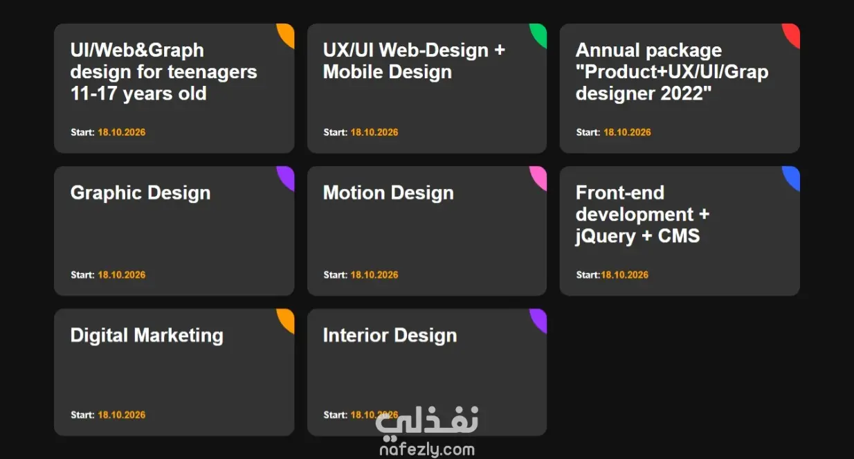 يتمثل العمل في بناء واجهة مستخدم رقمية عصرية لمنصة تعليمية تعتمد نظام الشبكة الذكية لعرض المسارات التدريبية، حيث يتم تنفيذ الصفحة باستخدام هيكلية HTML دقيقة تعتمد على العناصر الدلالية لضمان سهولة القراءة من قبل محركات البحث والمتصفحات، مع التركيز على إنشاء حاوية رئيسية مرنة تضم ثماني بطاقات تعريفية مستقلة. يتم تصميم الواجهة بروح "النظام الداكن" (Dark Mode) باستخدام خلفيات رمادية عميقة توفر راحة بصرية للمستخدم وتبرز النصوص البيضاء بوضوح عالي، مع تطعيم الزوايا العلوية لكل بطاقة بلمسات لونية حيوية مشفرة بصرياً لتمييز التخصصات المختلفة مثل البرتقالي للتصميم الجرافيكي والأزرق للتطوير والبنفسجي للموشن ديزاين.