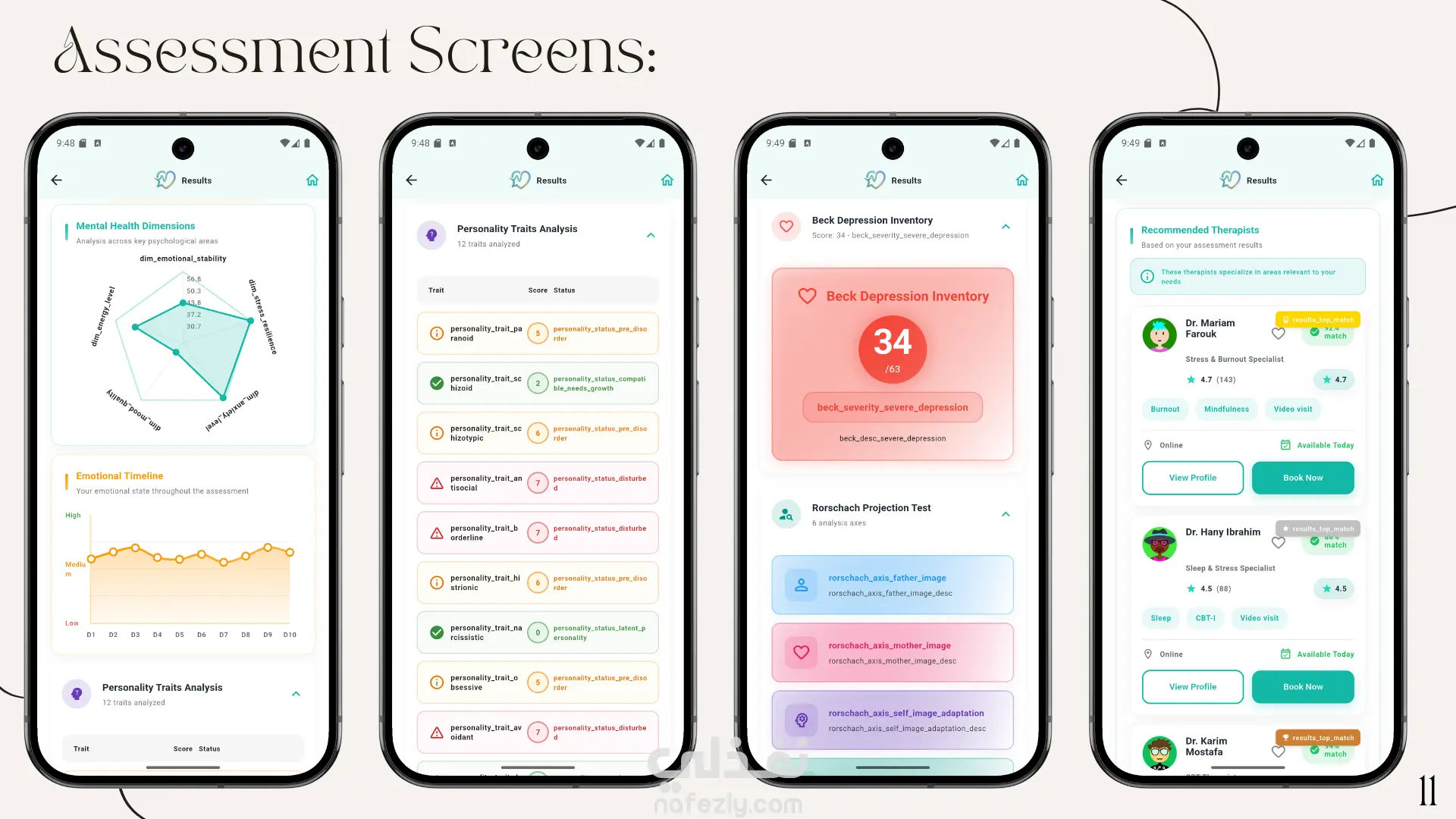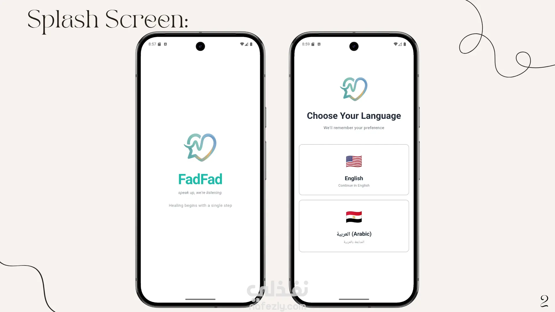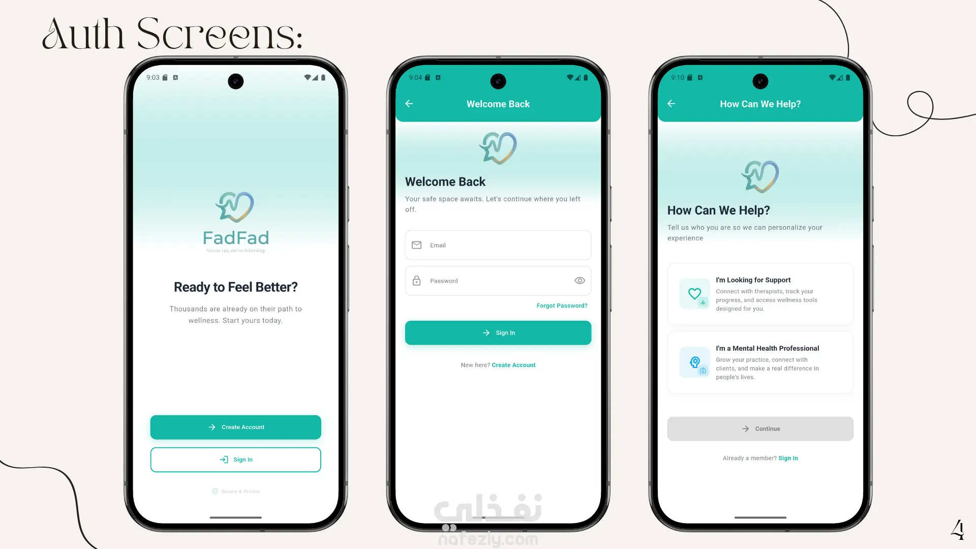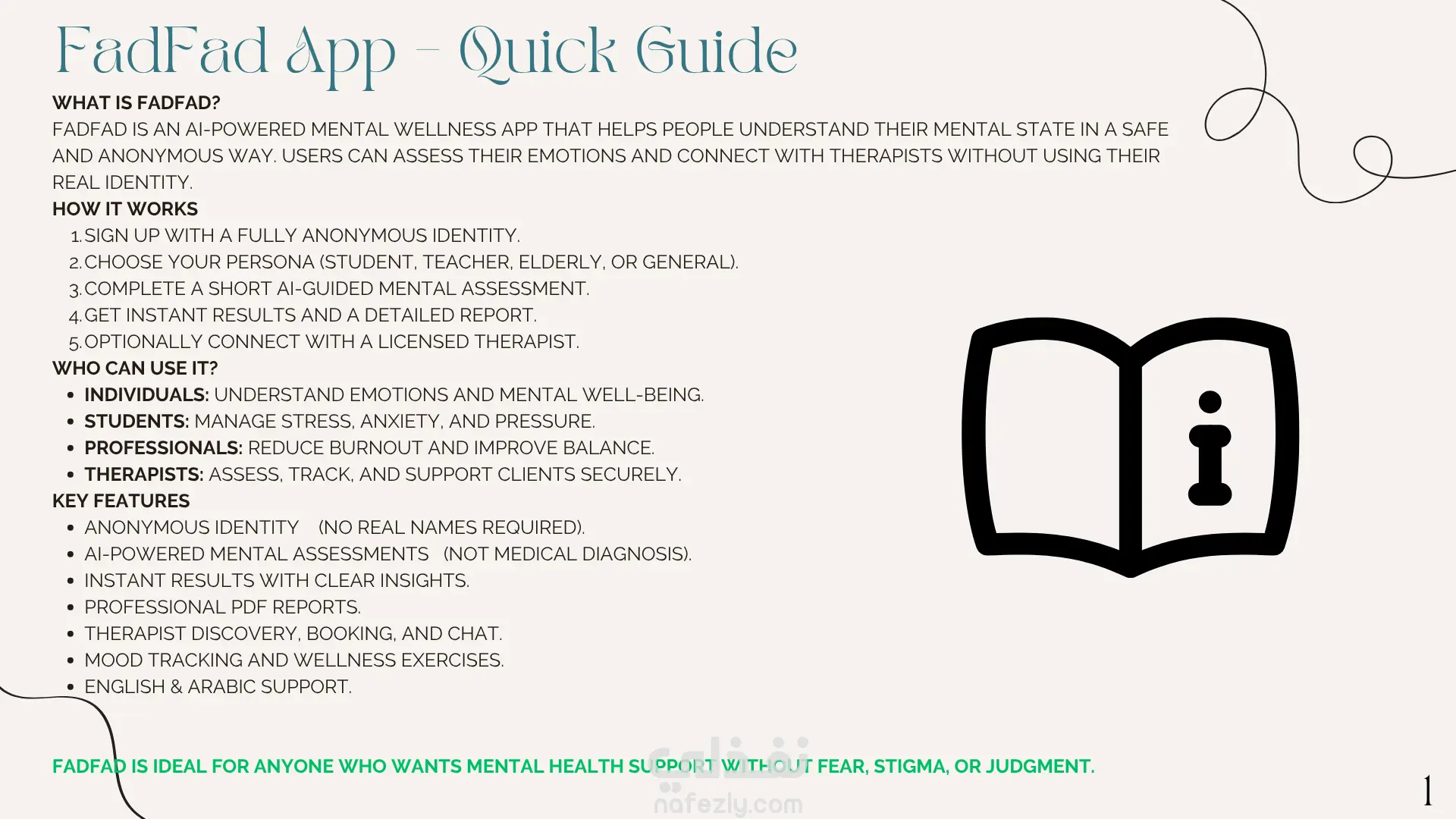 فضفض (FadFad) - تطبيق دعم الصحة النفسية "اتكلم... إحنا سامعينك" فضفض هو تطبيق ذكي يساعدك تفهم حالتك النفسية، تتابع مشاعرك يوميًا، وتوصل بسهولة لمعالجين متخصصين — وكل ده في بيئة آمنة وتحافظ على خصوصيتك. ------------فكرة التطبيق التطبيق معمول عشان يساعد الناس تتكلم وتفهم نفسها من غير خوف أو إحراج، ويقدم دعم نفسي بشكل بسيط وسهل الاستخدام. ------------ خصوصيتك أولاً * تقدر تستخدم التطبيق بدون ما تظهر اسمك الحقيقي * بيتم إنشاء اسم عشوائي ليك داخل التطبيق * بياناتك بتكون محمية ومش بيتم مشاركتها * مفيش أي ضغط اجتماعي أو إحراج ------------✨ أهم المميزات ------------ تقييم حالتك النفسية * تقدر تعمل تقييم سريع لحالتك * هتحصل على نتيجة واضحة وسهلة الفهم * التطبيق يقترح لك خطوات تساعدك تتحسن ------------ متابعة حالتك يوم بيوم * تسجل حالتك المزاجية يوميًا * تكتب ملاحظات عن يومك * تشوف تطورك مع الوقت بشكل بسيط ------------ الوصول لمعالجين متخصصين * تلاقي معالجين مناسبين لحالتك * تقدر تحجز جلسة بسهولة * تتابع مواعيدك من داخل التطبيق ------------ دردشة ودعم * إمكانية التواصل مع المعالج * تجربة مريحة وسهلة في الاستخدام ------------ تقارير مفيدة * تقارير توضح حالتك النفسية * تساعدك تفهم نفسك بشكل أفضل * ممكن تشاركها مع المعالج ------------ مناسب لكل المستخدمين التطبيق بيقدم تجربة مختلفة حسب المستخدم: * للطلاب (ضغط الدراسة) * للمعلمين (ضغط الشغل) * لكبار السن (الدعم والاهتمام) ------------ يدعم العربي والإنجليزي * تقدر تستخدم التطبيق باللغة اللي تفضلها * تصميم مريح وسهل الاستخدام ------------ بيشتغل على * موبايل (Android و iPhone) * كمبيوتر * متصفح الإنترنت ------------ حالة التطبيق * التطبيق جاهز بالكامل كنموذج أولي (MVP) * يمكن تطويره وربطه بسيرفر بسهولة * جاهز للإطلاق والتوسع ------------ مناسب لـ * مشاريع الصحة النفسية * تطبيقات استشارات أونلاين * منصات دعم ومساعدة * شركات ناشئة في مجال HealthTech