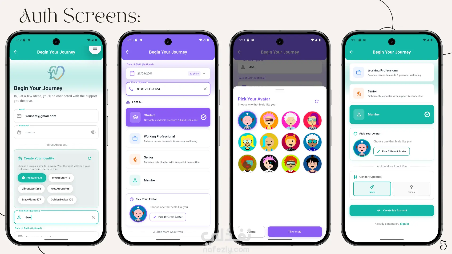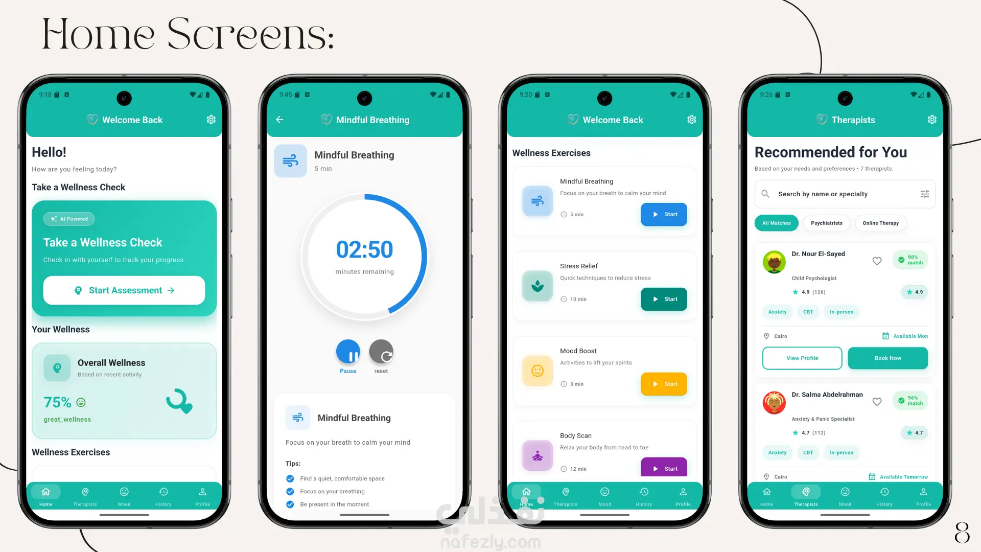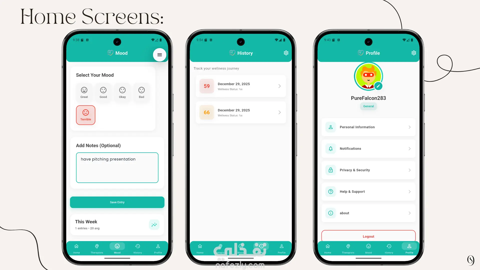 فضفض (FadFad) - تطبيق دعم الصحة النفسية "اتكلم... إحنا سامعينك" فضفض هو تطبيق ذكي يساعدك تفهم حالتك النفسية، تتابع مشاعرك يوميًا، وتوصل بسهولة لمعالجين متخصصين — وكل ده في بيئة آمنة وتحافظ على خصوصيتك. ------------فكرة التطبيق التطبيق معمول عشان يساعد الناس تتكلم وتفهم نفسها من غير خوف أو إحراج، ويقدم دعم نفسي بشكل بسيط وسهل الاستخدام. ------------ خصوصيتك أولاً * تقدر تستخدم التطبيق بدون ما تظهر اسمك الحقيقي * بيتم إنشاء اسم عشوائي ليك داخل التطبيق * بياناتك بتكون محمية ومش بيتم مشاركتها * مفيش أي ضغط اجتماعي أو إحراج ------------✨ أهم المميزات ------------ تقييم حالتك النفسية * تقدر تعمل تقييم سريع لحالتك * هتحصل على نتيجة واضحة وسهلة الفهم * التطبيق يقترح لك خطوات تساعدك تتحسن ------------ متابعة حالتك يوم بيوم * تسجل حالتك المزاجية يوميًا * تكتب ملاحظات عن يومك * تشوف تطورك مع الوقت بشكل بسيط ------------ الوصول لمعالجين متخصصين * تلاقي معالجين مناسبين لحالتك * تقدر تحجز جلسة بسهولة * تتابع مواعيدك من داخل التطبيق ------------ دردشة ودعم * إمكانية التواصل مع المعالج * تجربة مريحة وسهلة في الاستخدام ------------ تقارير مفيدة * تقارير توضح حالتك النفسية * تساعدك تفهم نفسك بشكل أفضل * ممكن تشاركها مع المعالج ------------ مناسب لكل المستخدمين التطبيق بيقدم تجربة مختلفة حسب المستخدم: * للطلاب (ضغط الدراسة) * للمعلمين (ضغط الشغل) * لكبار السن (الدعم والاهتمام) ------------ يدعم العربي والإنجليزي * تقدر تستخدم التطبيق باللغة اللي تفضلها * تصميم مريح وسهل الاستخدام ------------ بيشتغل على * موبايل (Android و iPhone) * كمبيوتر * متصفح الإنترنت ------------ حالة التطبيق * التطبيق جاهز بالكامل كنموذج أولي (MVP) * يمكن تطويره وربطه بسيرفر بسهولة * جاهز للإطلاق والتوسع ------------ مناسب لـ * مشاريع الصحة النفسية * تطبيقات استشارات أونلاين * منصات دعم ومساعدة * شركات ناشئة في مجال HealthTech