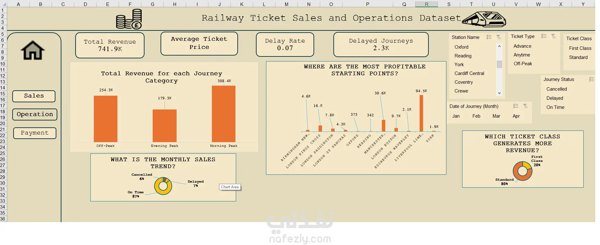 قمت بتنفيذ مشروع تحليل بيانات لحجوزات قطارات باستخدام Microsoft Excel، حيث تم التعامل مع البيانات الخام وتحويلها إلى لوحة معلومات تفاعلية تدعم اتخاذ القرار. ? الأدوات المستخدمة: Microsoft Excel Pivot Tables Pivot Charts Slicers Data Cleaning & Formatting ? خطوات التنفيذ: تنظيف البيانات وإزالة التكرارات تحويل الأعمدة إلى أنواعها الصحيحة (Date / Time / Numeric) إنشاء Pivot Tables لتحليل الإيرادات وعدد الرحلات حساب نسب التأخير والإلغاء تحليل أنواع التذاكر وتأثيرها على الإيرادات بناء Dashboard تفاعلي يحتوي على مؤشرات أداء رئيسية (KPIs) ? أهم النتائج: تذاكر Advance تمثل المصدر الأكبر للإيرادات تذاكر Anytime تسجل أعلى نسبة تأخير محطة London Kings Cross تحقق أعلى إيراد بسبب ارتفاع متوسط سعر التذكرة