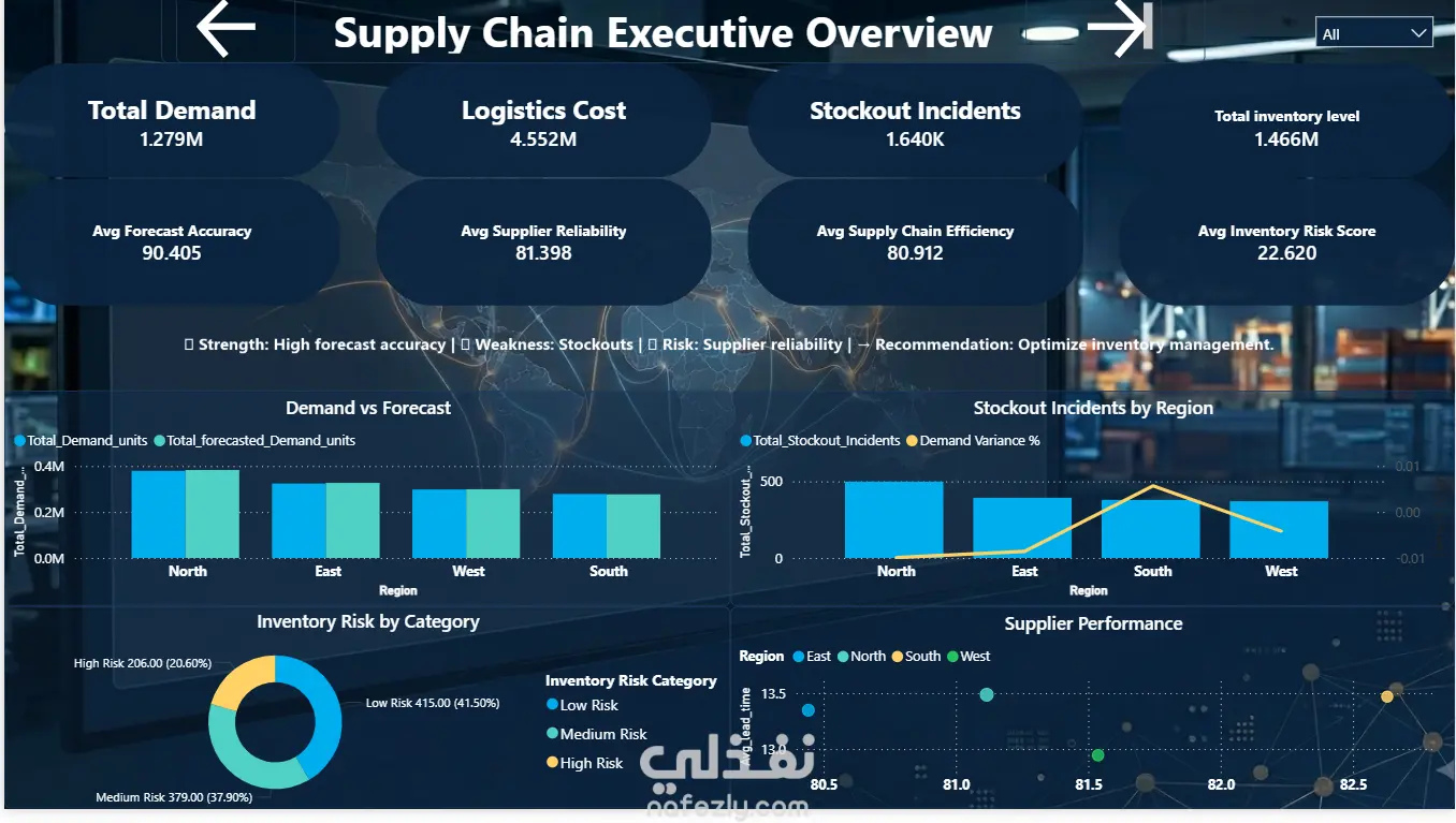 صممت لوحة تحكم Power BI احترافية لتحليل سلاسل الإمداد، بتقدم نظرة شاملة على إجمالي الطلب وتكاليف اللوجستيات مع دقة توقع وصلت لـ 90%. التقرير بيراقب مستويات المخزون لتجنب النقص ، وبيقيم أداء الموردين من حيث سرعة التوصيل والموثوقية. ميزته إنه بيحول الأرقام لتوصيات عملية تساعد في اتخاذ القرار و يقلل التكاليف ويزيد كفاءة العمل.