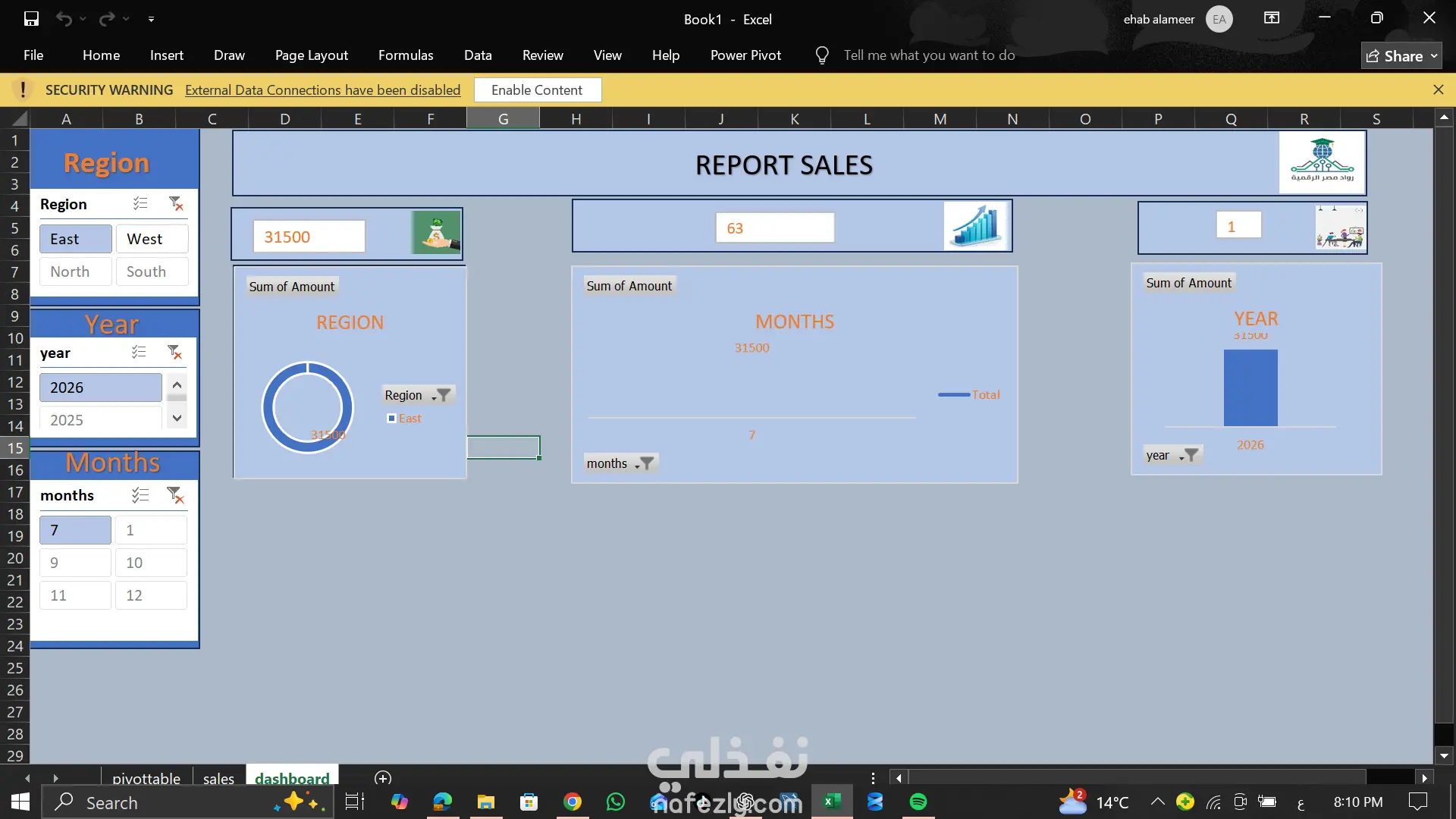 بناء نموذج تحليل مبيعات متكامل يساعد أصحاب الأعمال والمديرين على مراقبة تدفق الإيرادات، وتحليل سلوك العملاء، وتقييم أداء فريق المبيعات بشكل لحظي ودقيق. 2. المهام والحلول التقنية: هيكلة البيانات: تجميع ملفات المبيعات من مصادر مختلفة (فروع، مناديب، أونلاين) وربطها عبر Power Query. تنظيف البيانات: معالجة المرتجعات، الخصومات، والبيانات المكررة لضمان دقة الأرقام النهائية. أتمتة التقارير: جعل الداشبورد يتحدث تلقائياً بمجرد إضافة بيانات المبيعات الجديدة (Refresh). 3. المؤشرات والتحليلات التي توفرها اللوحة (Sales KPIs): صافي المبيعات والأرباح: تتبع الإيرادات الإجمالية مقابل التكاليف (Gross Profit). تحليل المنتجات (Product Analysis): تصنيف المنتجات حسب الأكثر مبيعاً والأكثر ربحية (Top Sellers). تحليل المناطق والمناديب: مقارنة أداء كل فرع أو مندوب مبيعات لتحفيز الفريق. تحليل العملاء: معرفة معدل شراء العميل وتحديد العملاء الأكثر ولاءً. النمو السنوي/الشهري (YoY/MoM Growth): مقارنة مبيعات الشهر الحالي بنفس الشهر من العام السابق. 4. القيمة المضافة للعميل: تحديد المنتجات الراكدة لاتخاذ قرار بشأن العروض أو التصفية. توفير الوقت الضائع في كتابة التقارير اليدوية أسبوعياً. رؤية واضحة للتدفق النقدي تساعد في التخطيط للمخزون المستقبلي. الأدوات المستخدمة: Advanced Excel: استخدام الدوال المتقدمة و الـ Pivot Tables. Power Query: لربط البيانات الضخمة ومعالجتها بسرعة. Data Visualization: استخدام رسوم بيانية (Charts) احترافية مثل (Trend Lines, Heat Maps).